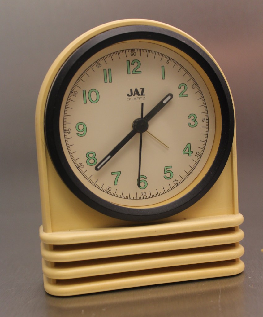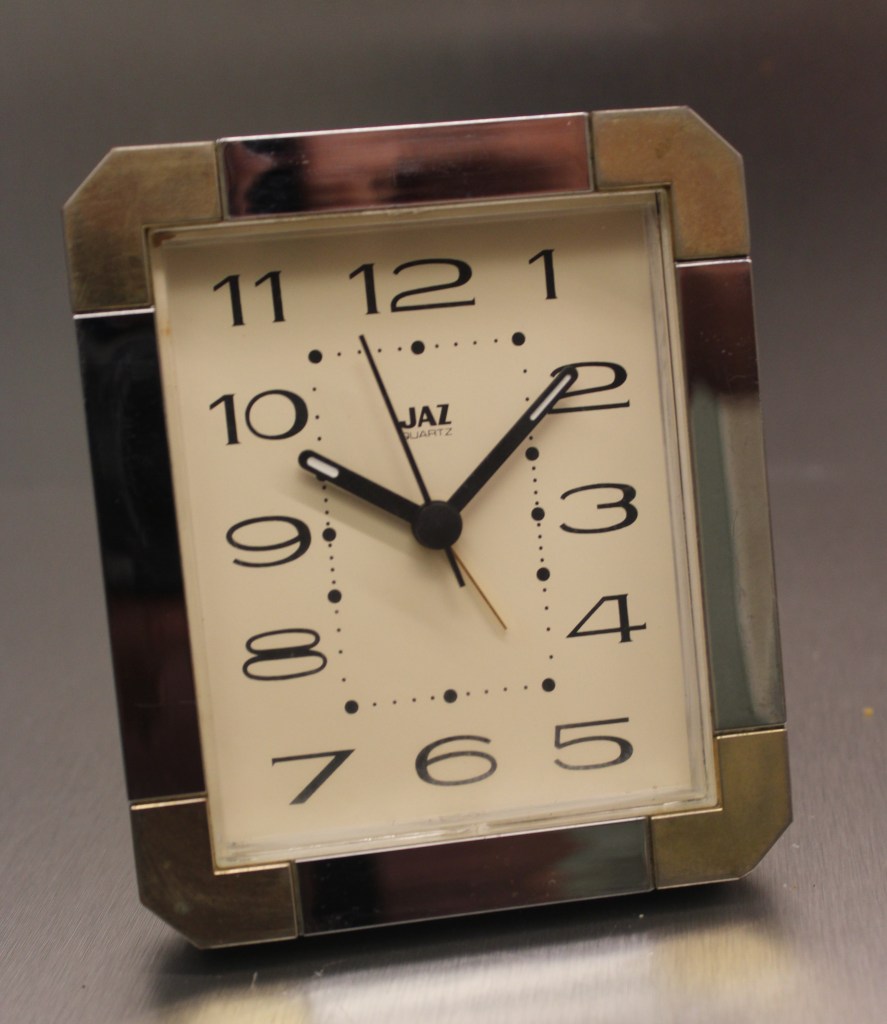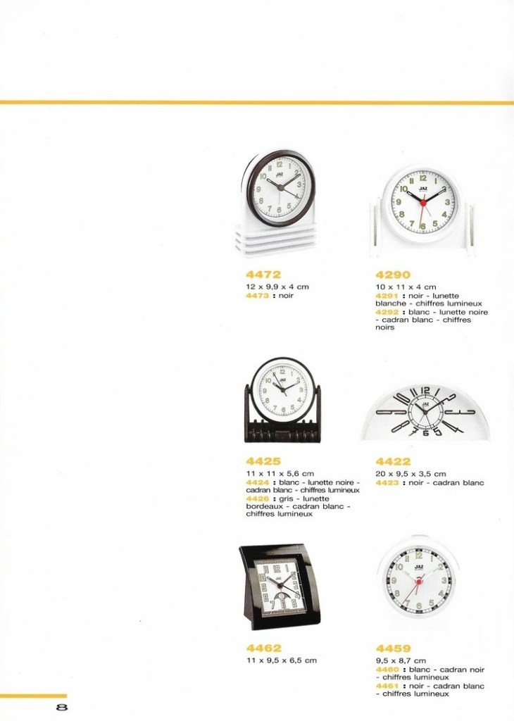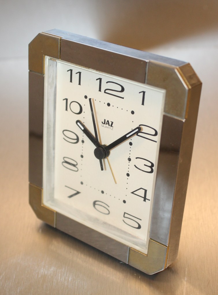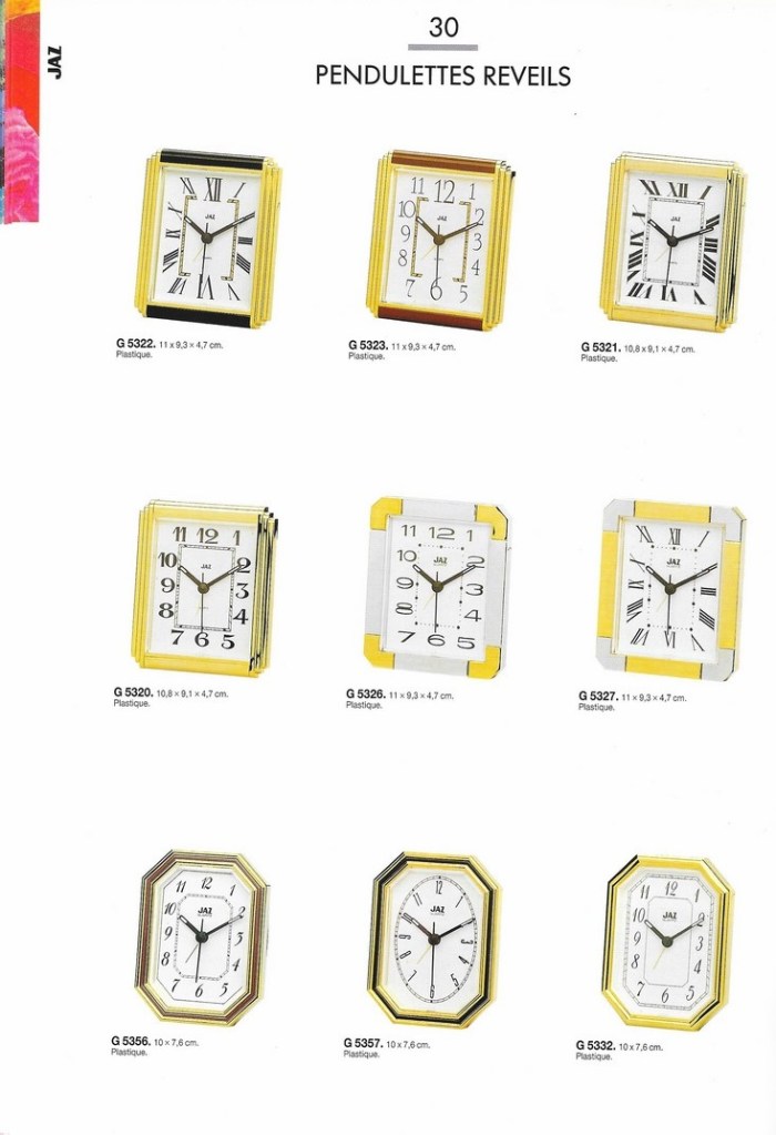 5326/5327 , réveil , corps en plastique métallisé , aiguilles noires en plastique aiguilles lumineuses , trotteuse centrale noire, mouvement quartz à pile LR6 , format 11 x 9,3 x 4,7 cm , poids 140 gr sans la pile . Première apparition dans le complément « JAZ nouveautés 89″ présent jusqu’aux catalogues 1994/1995 et 1997/1998 . chiffres arabes 5326, chiffres romains 5327.