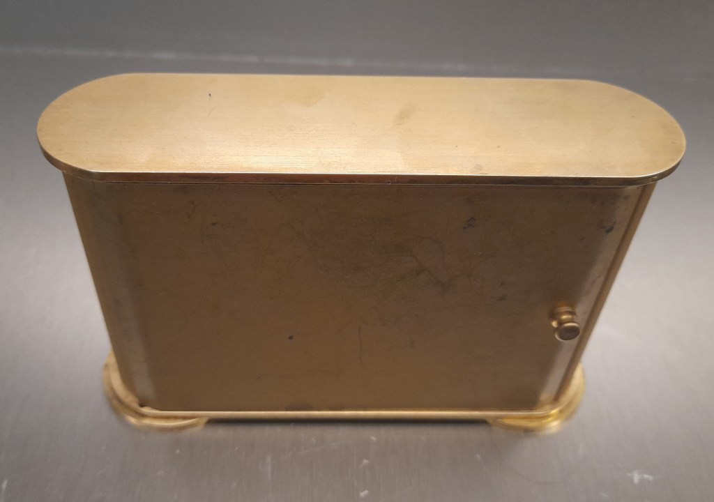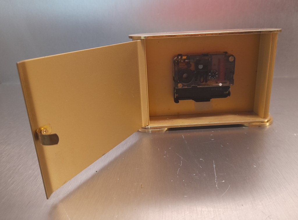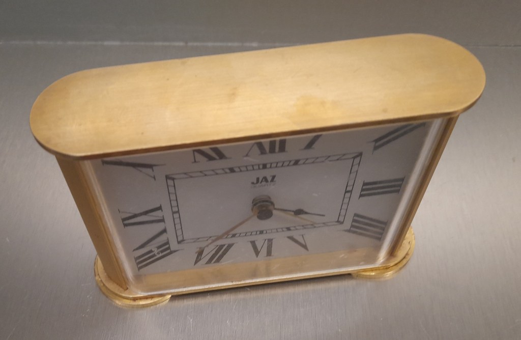 5128 , réveil bois Bubinga massif , gamme Jaz Quartz forme ronde , lunette dorée , chiffres romains , aiguilles noires en plastique , trotteuse centrale noire , chemin de fer à l’intérieur de la zone des chiffres , mouvement quartz Tochigi Tokei Japan à pile LR6 , hauteur 13,5 cm , poids 340 gr sans la pile . Présent aux catalogues 1991:1992 /1992/1993:1994 et 1994:1995 . Il faut tirer sur le bouton pour changer l’heure et l’enfoncer pour le réveil ; le bouton est juste clipsé il faut tirer fort pour l’enlever ; Existe en hêtre massif référencé 5127.