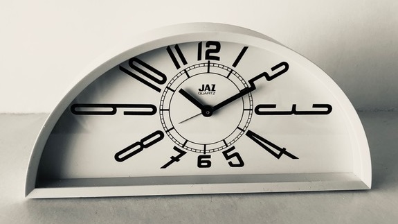 7238 horloge murale à dateur jour et date, mouvement quartz à pile LR6, forme octogonale en plastique noir, trotteuse centrale noire, chemin de fer à l’intérieur de la zone des chiffres. absente des catalogues , sa référence présente au dos nous permet cette estimation circa 1991 à 1994 Format 25 x 25cm