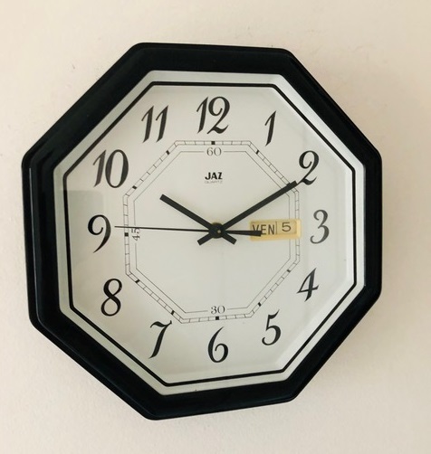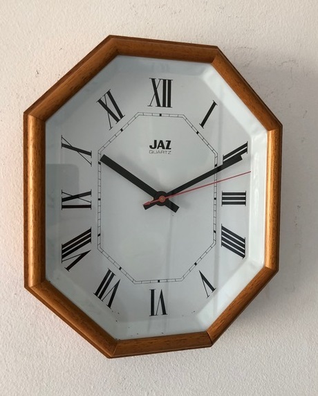 6075, horloge octogonale en bois naturel, gamme Jaz Quartz , à pile LR6, cadran métal émaillé blanc en cuvette, chiffres romains, aiguilles noires , trotteuse centrale noire à talon, chemin de fer octogonal à l’intérieur de la zone des heures , nouveauté du catalogue 1987/88 page 28 disponible jusqu’en 1992
