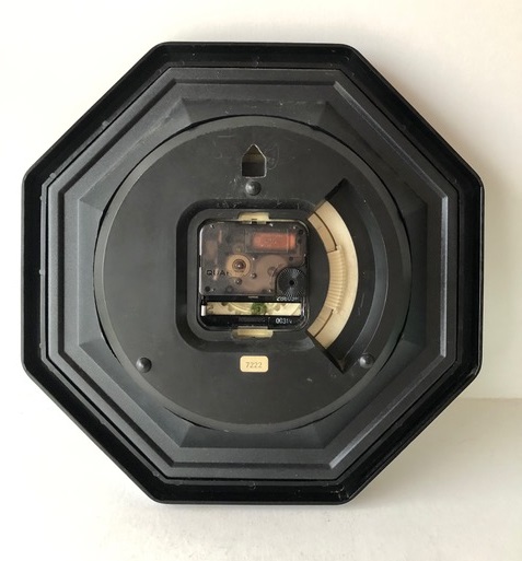 7222, horloge murale à dateur: jour et date , gamme Jaz Quartz , à pile LR6 , corps octogonale en plastique noir , aiguilles bâtons noires , trotteuse centrale noire , chiffres Breguet , chemin de fer octogonal à l’intérieur de la zone des chiffres numéroté jusqu’à 60 . Format 25 x 25 cm ; Nouveauté du catalogue 1992 à la page 5 et présente jusqu’au catalogue 1994/19951992 à 1995