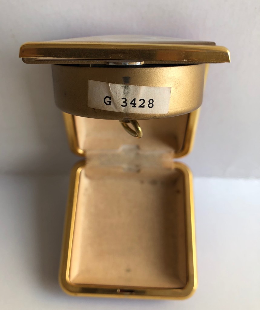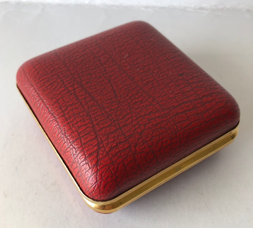G3428 réveil de voyage , portefeuille gainé de skaï façon cuir rouge , mouvement mécanique 2 jewels , aiguilles et points lumineux , disponible en 1994/1995 uniquement . format 7 x 7 x 3 cm .