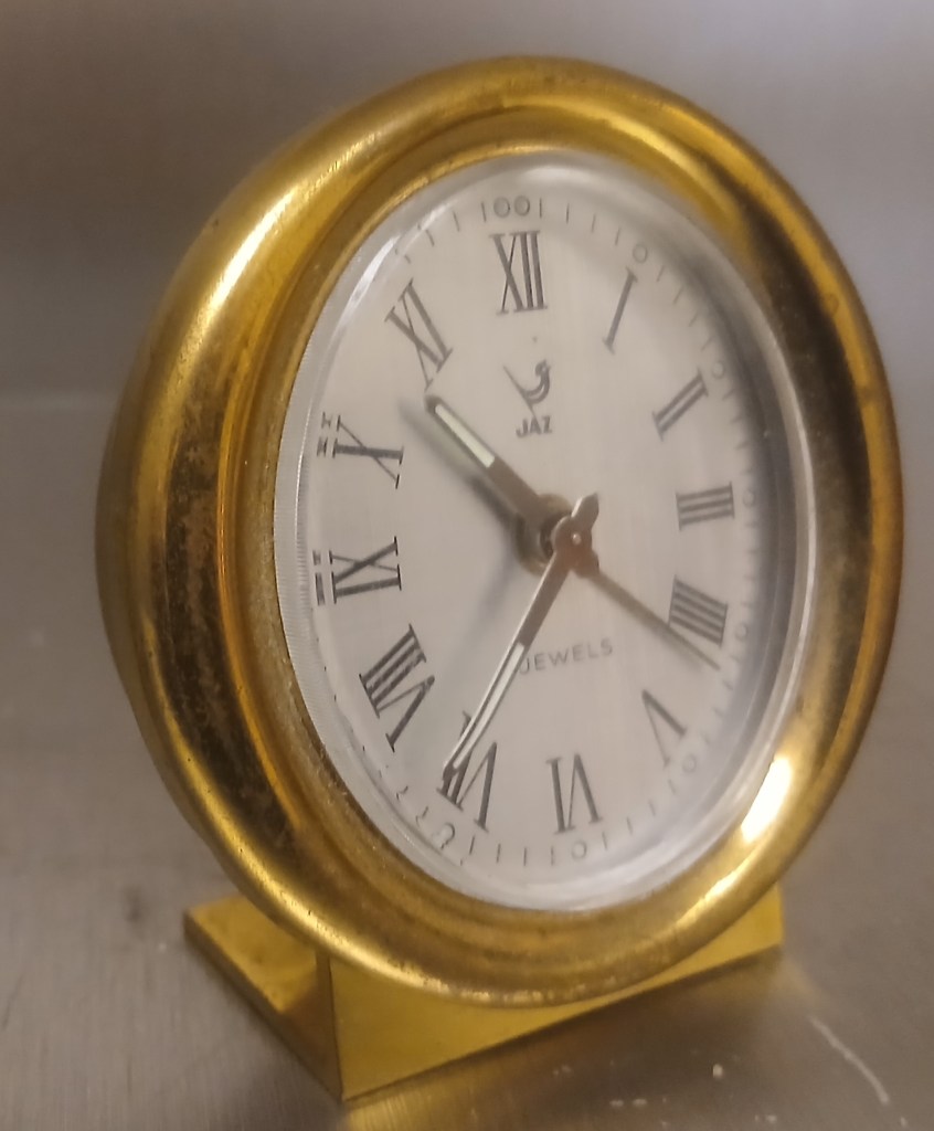COTIC , petit réveil de la gamme des Jaz de Luxe , mouvement mécanique , calibre AB, 7 pierres, échappement à ancre , sonnerie limitable , aiguilles alpha ou rectangles . Nouveauté du catalogue 1953 à la page 6 . Boîtier laqué noire , socle et lunette avant cuivré pour la version noire et doré pour les autres versions, cadran argenté ,aiguilles et points lumineux , vitre en plexiglas . Format 7,5 x 7 cm , poids 215 gr.