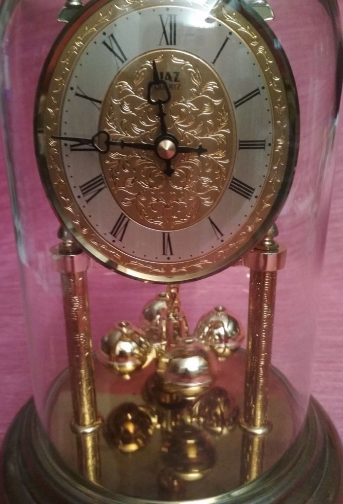 7805 horloge style 400 jours, Jaz Quartz à pile LR14 sous le socle , chiffres romains sur cadran ovale ciselé , tout métal sauf le dos , sous globe en verre , Made in Germany , colonnes ciselées , cadran laitonné, disponible de 1993 à 1995 , hauteur 21 cm , poids 910 gr.