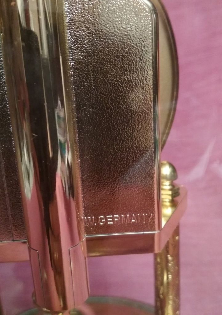7858 pendule à poser à quartz style 400 jours à sonnerie électronique sur haut parleur, sous cloche, nouveauté du catalogue 1991 jusqu’au catalogue 2000. Made in Germany. Socle en métal Hauteur: 30 cm. Pile LR6 pour le mouvement et pile LR14 sous le socle pour la sonnerie.