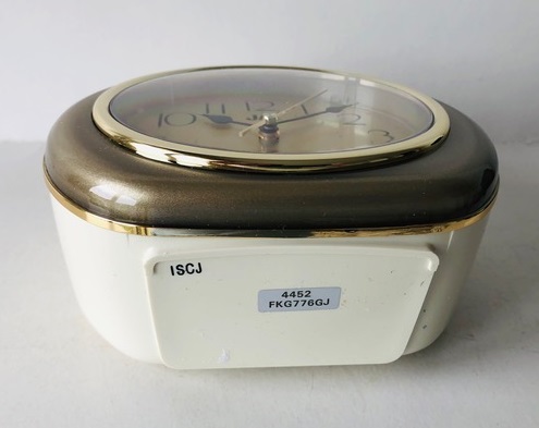 4452 , réveil quartz à pile LR14. Coque en plastique grise et blanche métallisé, aiguilles poires noires, trotteuse centrale dorée, arrêt de sonnerie au sommet , dim 12,3 x 13,4 x 6,4 cm. Poids: 227 gr , nouveauté du catalogue 1992 (fascicule réveils quartz simples) disponible jusqu’en 1994