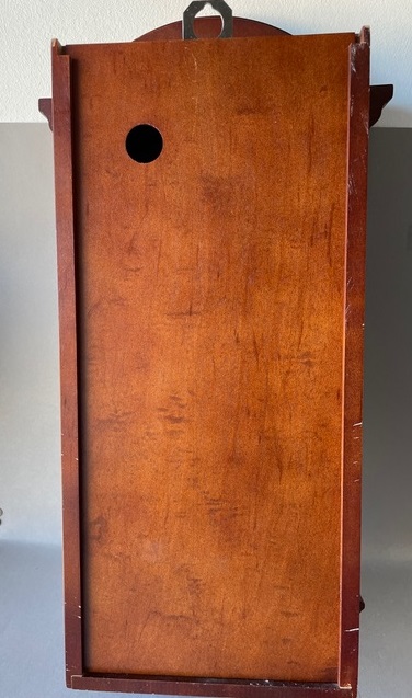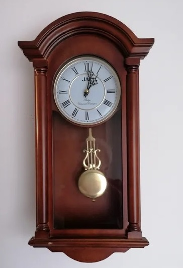 7620 pendule murale en bois teinté noyer foncé, carillon Westminster, gamme Jaz Paris , mouvement quartz à pile LR20 , le balancier est animé mais son utilité est fictive, chiffres romains , chemin de fer au pourtour du cadran métal, nouveauté du catalogue 1986, disponible jusqu’en 1989 Format: 54 x 24,5 cm. Pile LR20