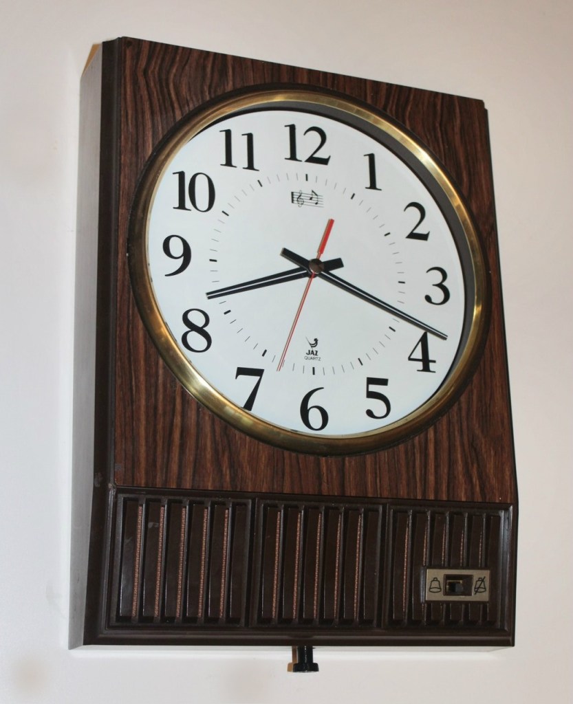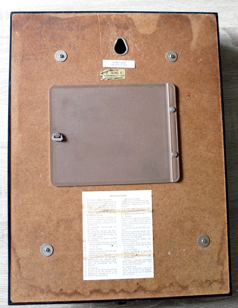 La molette en dessous présente l’avantage de ne pas avoir à enlever l’horloger du mur pour changer l’heure : autre avantage : il remet la trotteuse à XII comme un chronomètre ; la sonnerie est débrayable , il faut manipuler le bouton de sonnerie en façade , en bas à droite , et tirer sur la tirette .