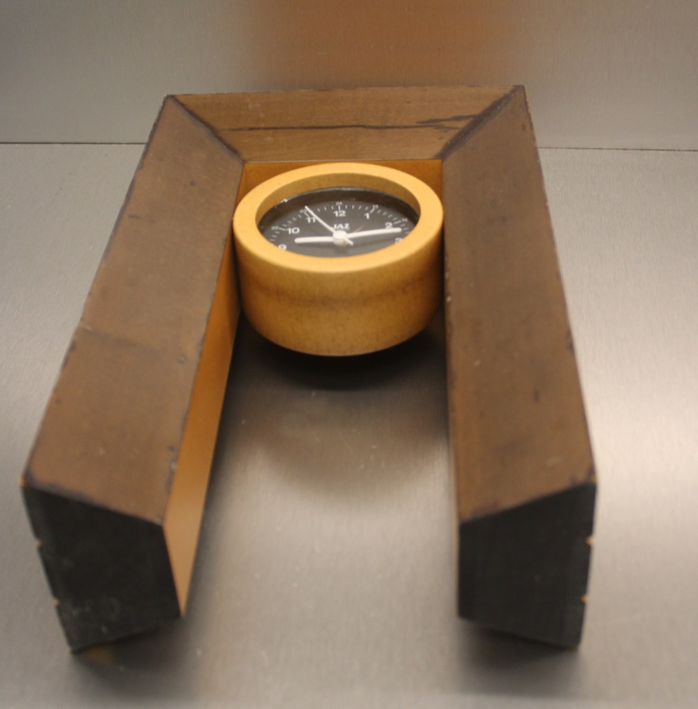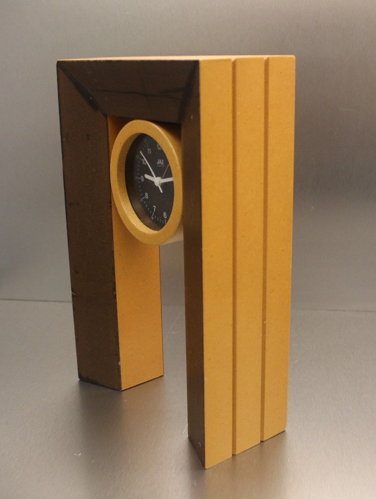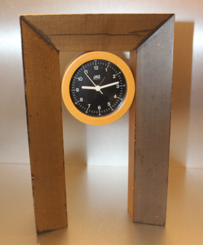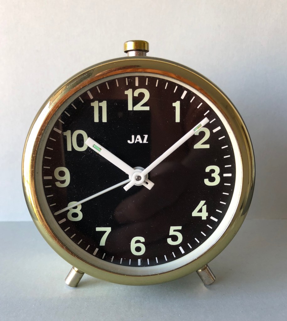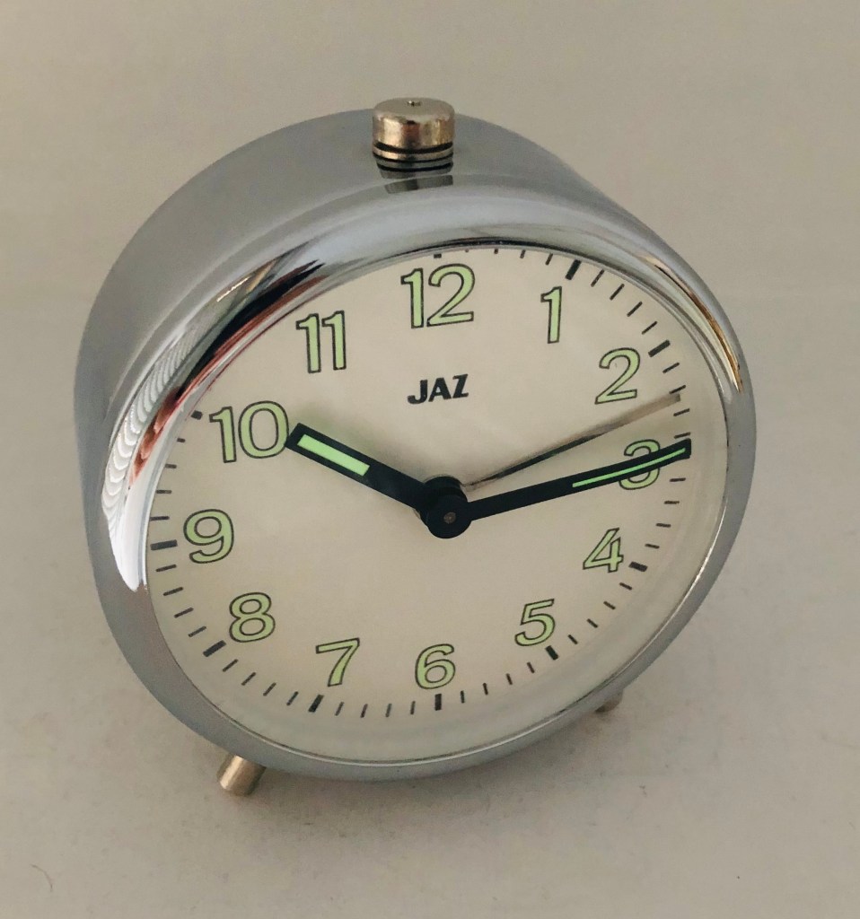 Waterman , réveil par Jaz, corps en aluminium brossé, existe avec cadran argenté ou cadran noir, aiguilles lumineuses, aiguilles noires, pas de chiffres mais des plots en guise d’index, trotteuse centrale,