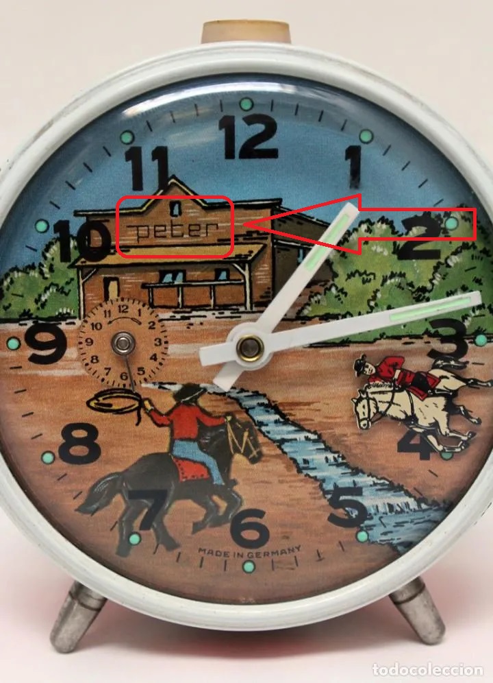 DADIC , réveil animé , mouvement mécanique , calibre PA . Nouveauté du catalogue 1983 à la page 4 , référencée 1257-81. Corps en métal brun , cloche arrière emboîtée , arrêt de sonnerie sous la bélière , vitre en verre plat , aiguilles blanches , aiguilles lumineuses , animation : le cavalier et son cheval à droite . Diamètre 10,8 cm , poids 325 gr . Les DADIC sont apparus en 1976 avec tout d’abord les modèles clown et moto , subissant quelques évolutions esthétiques au cours des années . En 1983 apparaissent 4 versions supplémentaires : ce Far West , Football , Chat-Souris et Princesse – Colombes .