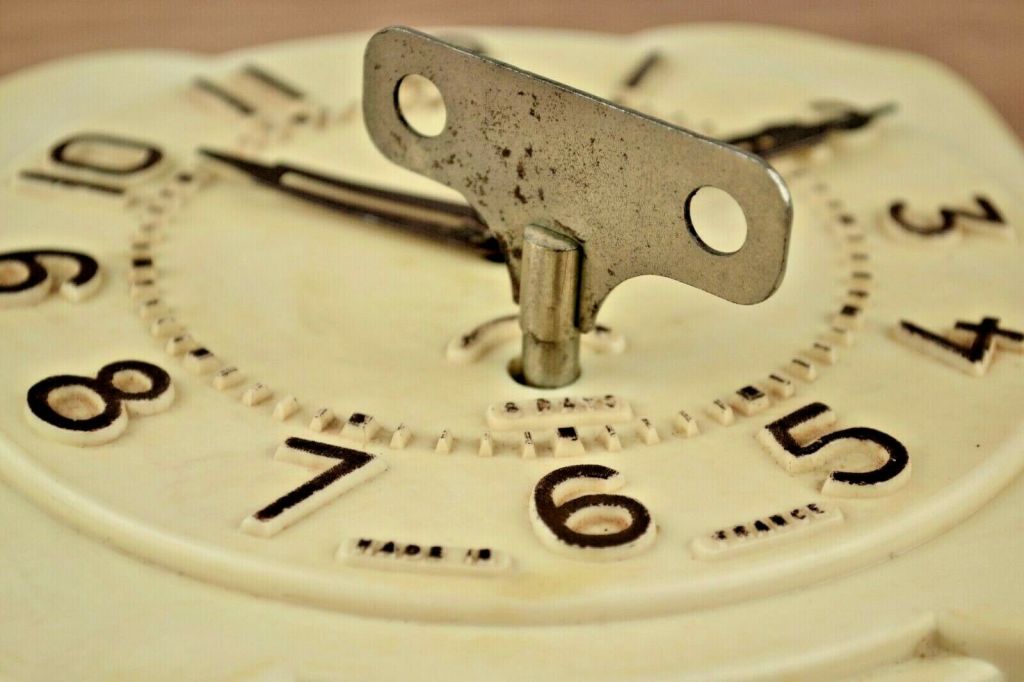 une petite fenêtre triangulaire de témoin de charge du ressort passe au rouge quand l’horloge doit être remontée