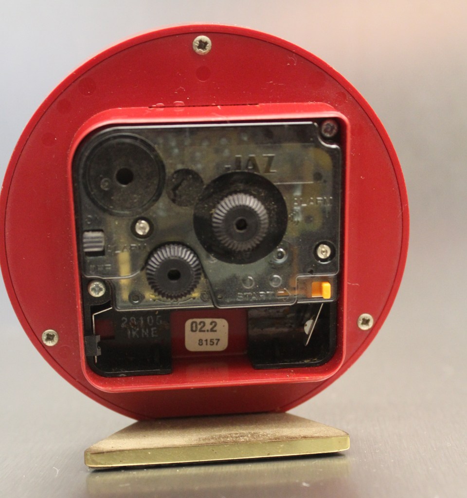 CERIC , réveil de la gamme Jaz Quartz , mouvement quartz RPK , à pile LR6 . Nouveauté du catalogue 1983 à la page 12 , référencé 8157-61 . Boîtier en plastique couleur bordeaux et lunette métal doré , sur socle laiton , chiffres romains, trotteuse centrale dorée, chemin de fer allégé numéroté jusqu’à 60 au pourtour du cadran , aiguilles flèches noires , aiguilles et points lumineux . Mention Paris France en bas de cadran ; Diamètre 9,5 cm Il n’est plus disponible en 1985 . Sa couleur cerise est à l’origine de son nom qui avait déjà été attribué en 1968 .