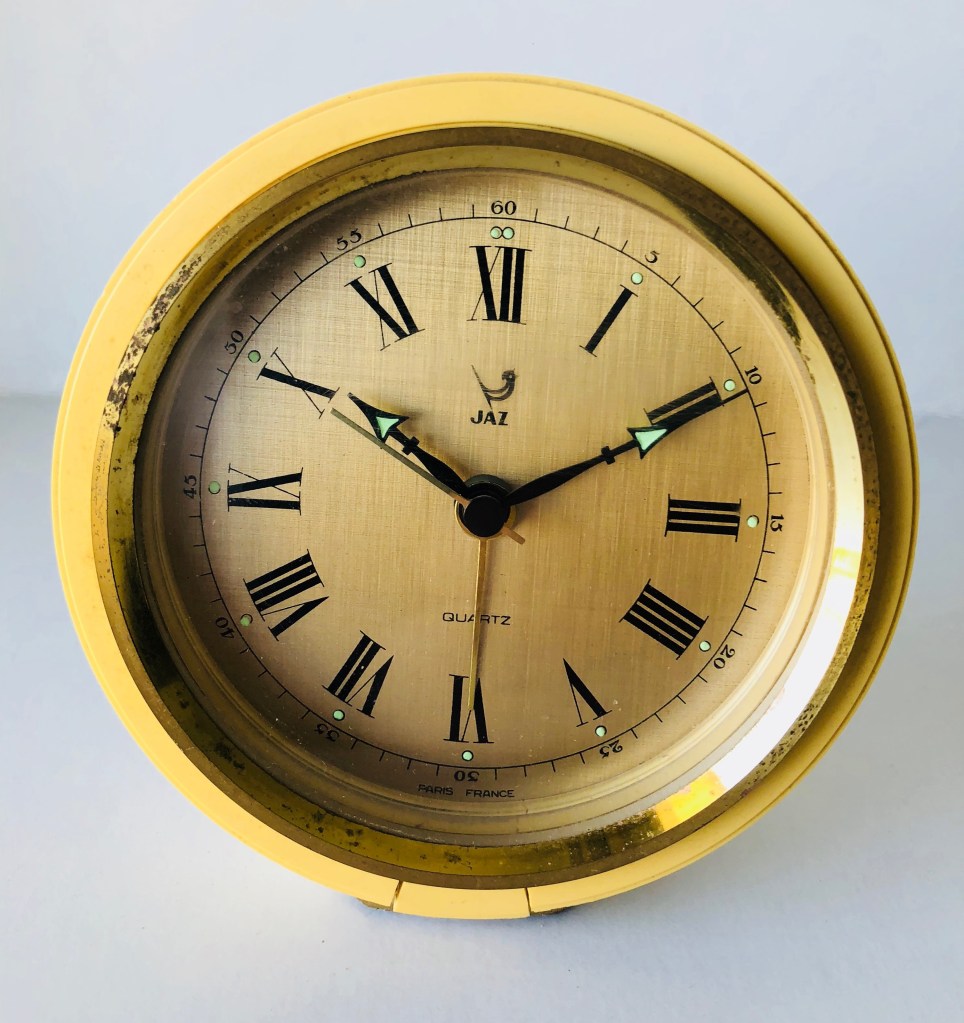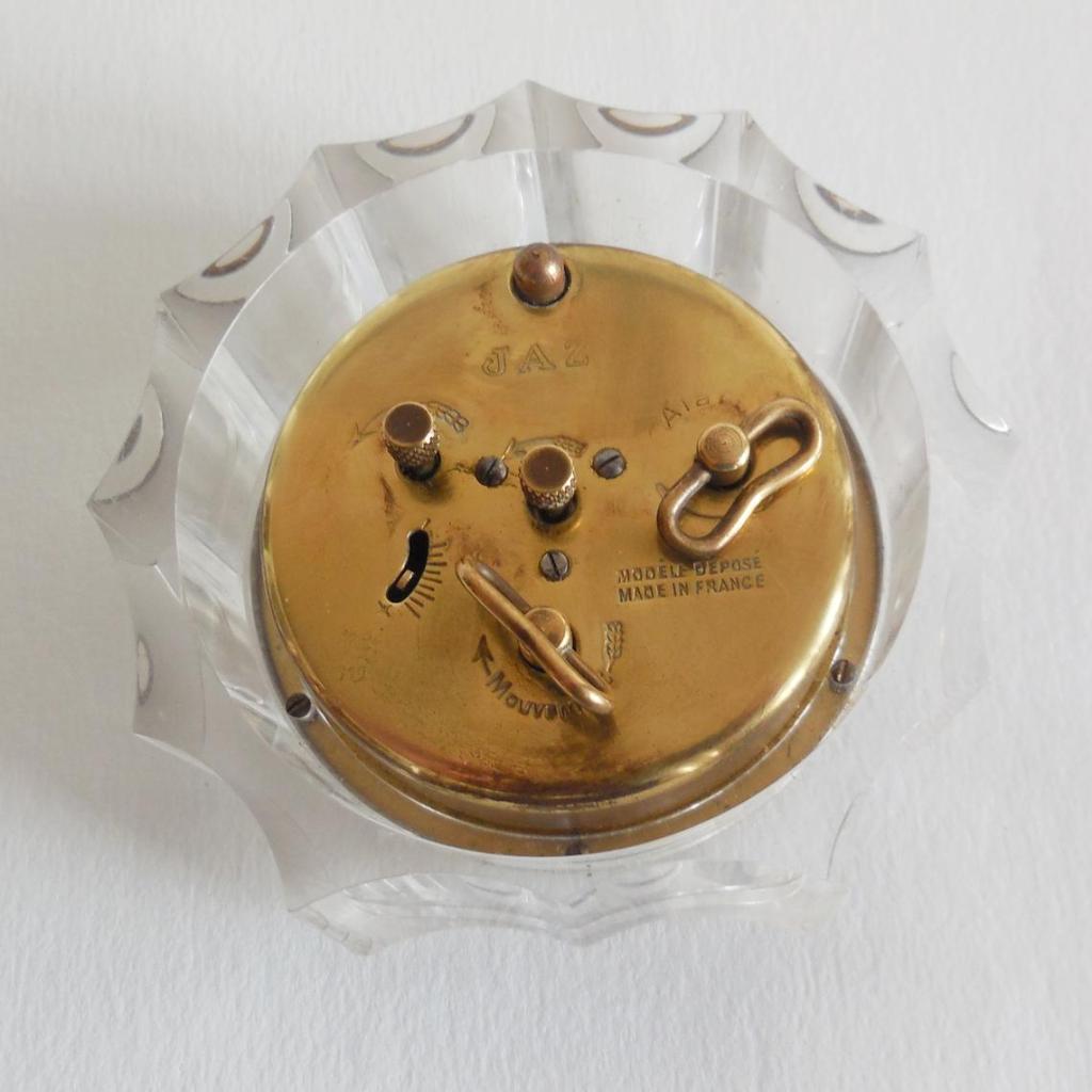 Grand réveil de la gamme des Jaz de Luxe , mouvement mécanique , calibre 5 AF , mono-barillet donc une seule clef de remontage , 7 jewels , autonomie 8 jours , pas de chiffres mais des index . Boîtier en laiton doré , chevalet , cadran décoré blanc et « or » , lunette concave et excentrique plus large en bas qu’en haut , aiguilles en métal doré , vitre en verre plat , aiguilles et points lumineux . Diamètre 13,8 cm , poids 560 gr .