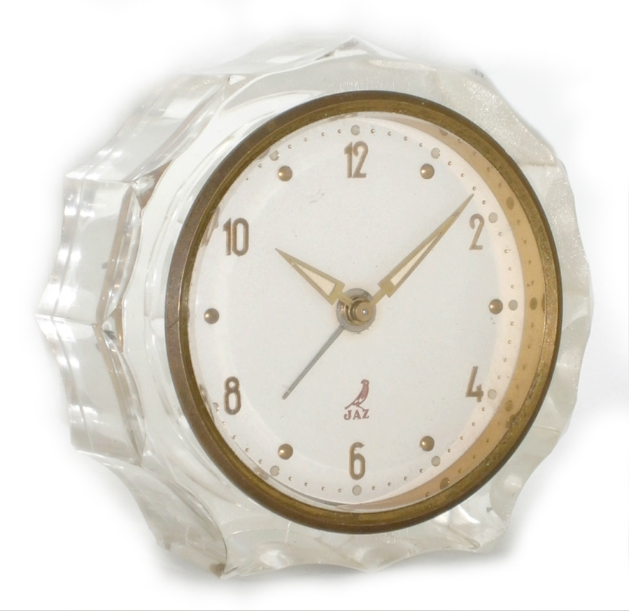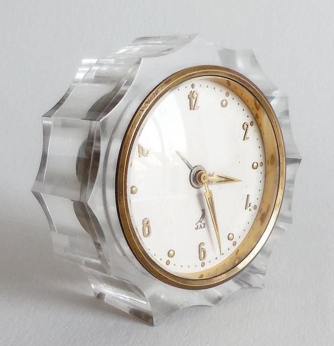 JANVIC , petit réveil , gamme des Stylites , mouvement mécanique , calibre 1J . Nouveauté catalogue 1956 à la page 12 , référencée 353-11 . Boîtier taillé dans un bloc de plexiglas , lunette biseautée en métal doré poli , cadran blanc , six chiffres arabes et points d’heures , présenté en coffret cadeau , aiguilles lances/ flèches , aiguilles et points lumineux . Diamètre total 8 cm , diamètre lunette 6.5 cm , épaisseur 3 cm , poids 250 gr. Dernière apparition au catalogue 1959/60 .