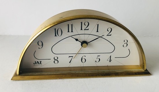 5086 réveil, gamme Jaz Quartz et gamme les Classiques, corps en laiton massif en demi lune, cadran blanc à chiffres arabes, aiguilles noires poire et feuille, mouvement quartz à pile LR6 . Format L: 16,5 cm, prof: 4,5 cm, haut:7,5 cm, poids: 525 gr, nouveauté du catalogue 1990 dans « les classiques » présente jusqu’au catalogue 1992