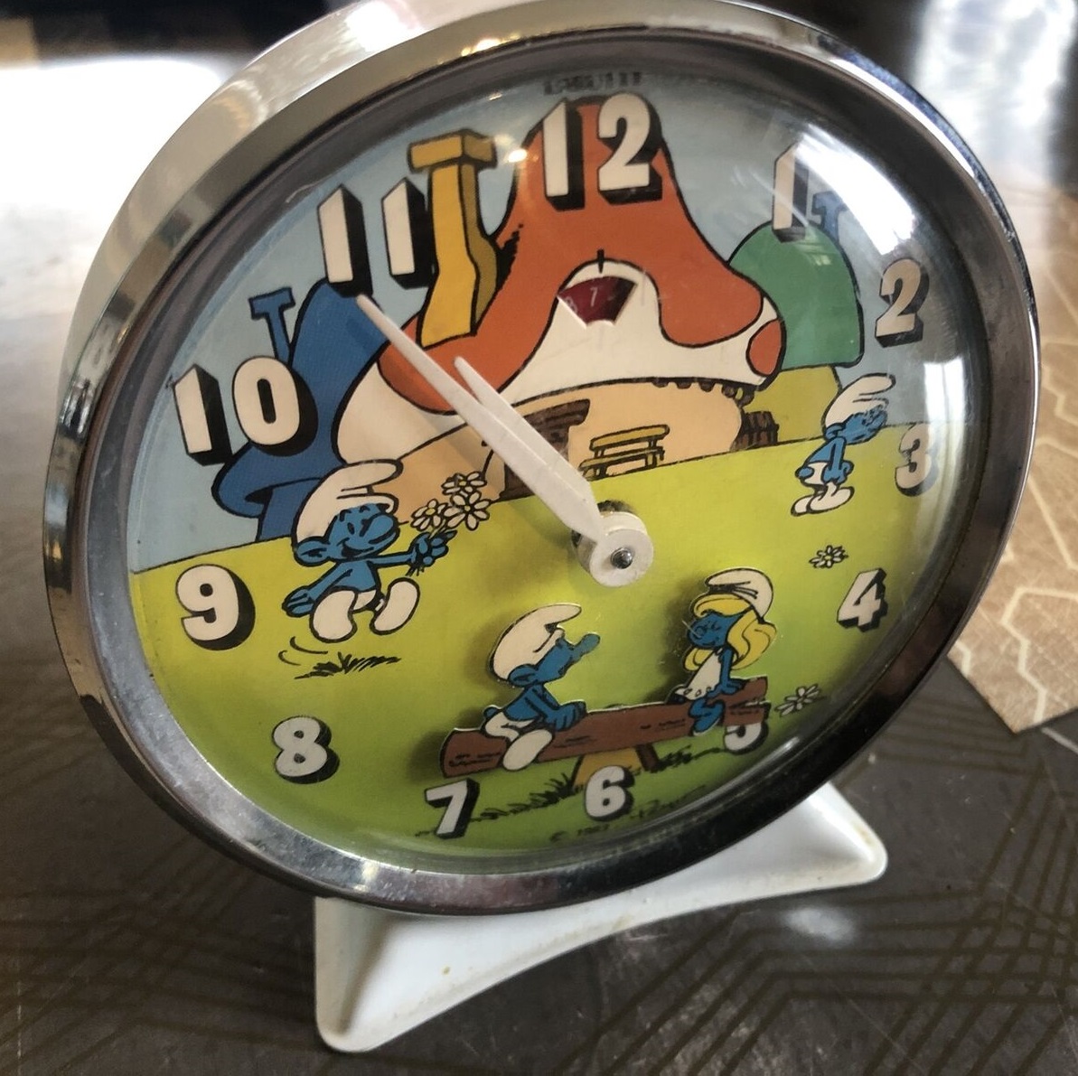 SCHTROUMPF , réveil animé , mouvement mécanique , calibre PA made in Germany par Peter Uhren . Corps en métal couleur bleu , dos emboîté , diamètre 11 cm , poids 315 gr. arrêt de sonnerie au sommet , petit cadran du réveil en façade entre l’axe central et le XII , ,aiguilles lumineuses mais ni chiffres ni points lumineux , aiguille pontife pour l’heure . De dos , le Grand Schtroumpf se dandine à chaque seconde . Nouveauté du catalogue Jaz 1986 à la page 20 , référencée 2737 sous la marque Japy et jusqu’en 1988 . Toutefois à l’export , ils sont vendus avec le logo JAZ car la marque au jaseur n’ exploitait pas le nom de sa filiale à l’étranger . Il apparaît sous l’estampille Jaz en France , uniquement dans le catalogue Jaz 1990 , catégorie Les Classiques à la page 18 réf. 2525 .