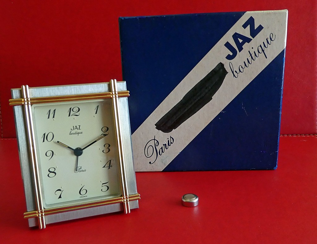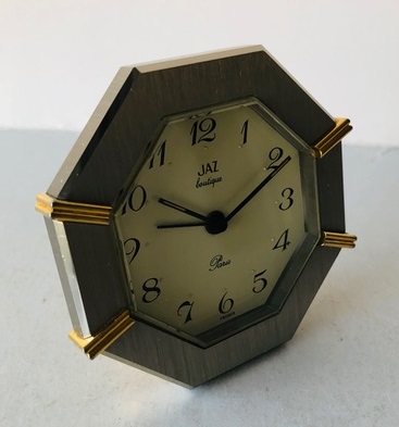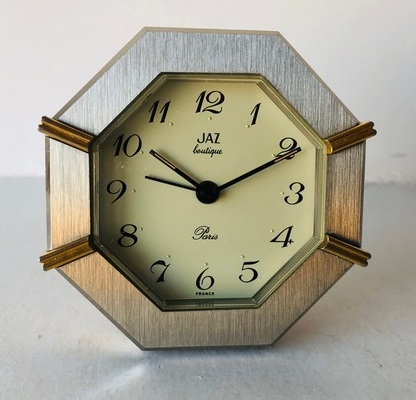 8213-21 en 1984 puis 5215 à partir de 1985, réveil de bureau à poser , dateur à date sans jour, forme octogonale , gamme Jaz Boutique , mention Paris et France en bas de cadran , corps en acier brossé à décor en laiton doré , aiguilles noires , aiguilles et points lumineux , chiffres romains, arrêt de sonnerie au dos , quartz , à pile bouton LR44 , nouveauté du catalogue 1984 , dernière apparition au catalogue 1986. Format 6,3 x 6,3 cm, poids 303 gr.