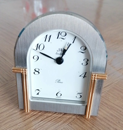 5209 , gamme Jaz Boutique , corps acier et laiton doré massifs induisant un poids important pour la taille , réveil borne , nouveauté du catalogue 1985 à la page 6 , aiguilles et points lumineux , vitre ronde en plexiglas chiffres romains sur cadran blanc , mention France en bas de cadran , arrêt de sonnerie au dos , mouvement quartz , calibre 21306 à pile bouton LR44 , format 11 x 10 cm , poids 380 gr . Pour changer l’heure il faut enlever le cache arrière .