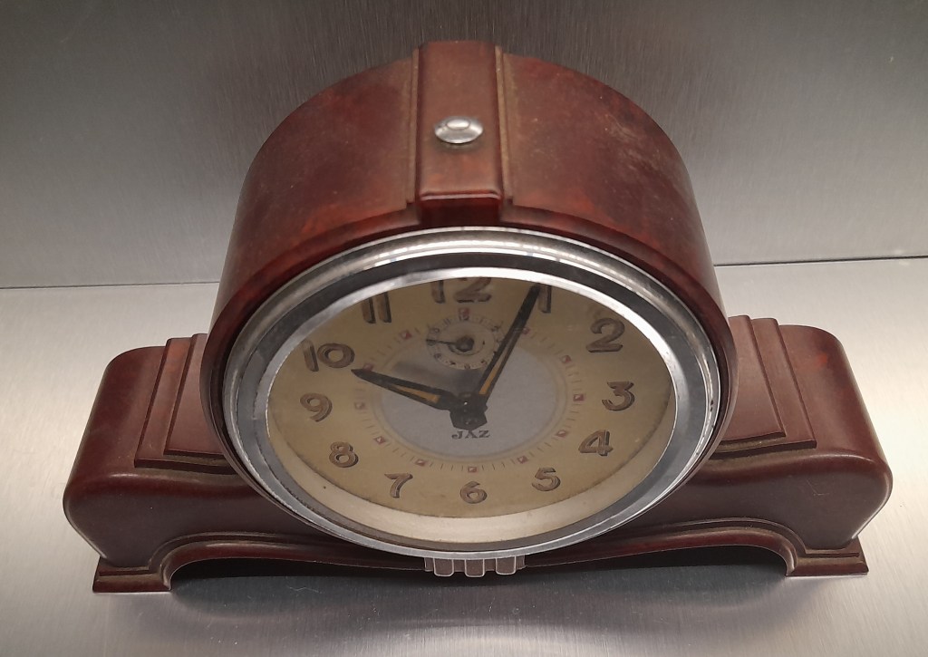 LORRIC n°462 daté 8.37 sur le marteau LORRIC , grand réveil , gamme des Pendulites , mouvement mécanique , calibre 1D et calibre 3D répétition . Nouveauté du catalogue de l’été 1937 à la page 13 . Boîtier tout en Jazolite , lunette chromée , arrêt de sonnerie au sommet , cadran blanc avec les 4 chiffres 12/3/6/9 sur cartouches verts .Variante de couleur référencée n°460 pour le noyer frisé deux tons et n°462 pour le thuya ci-dessus . Format 22,5 x 14 cm , poids 680 gr .Au dos , on reconnaît aisément la cloche en creux typique du premier réveil Jaz , le CLASSIC de 1921 . Rien de plus normal puisque les grands Pendulites d’avant guerre , comme les PERSIC , LORRIC et LOTIC , sont des réveils de base dont Jaz a judicieusement remplacé les boîtiers ronds en métal par des cages en bakélite de style Art Déco