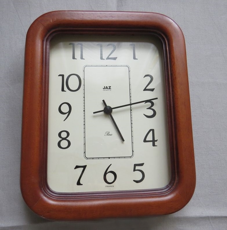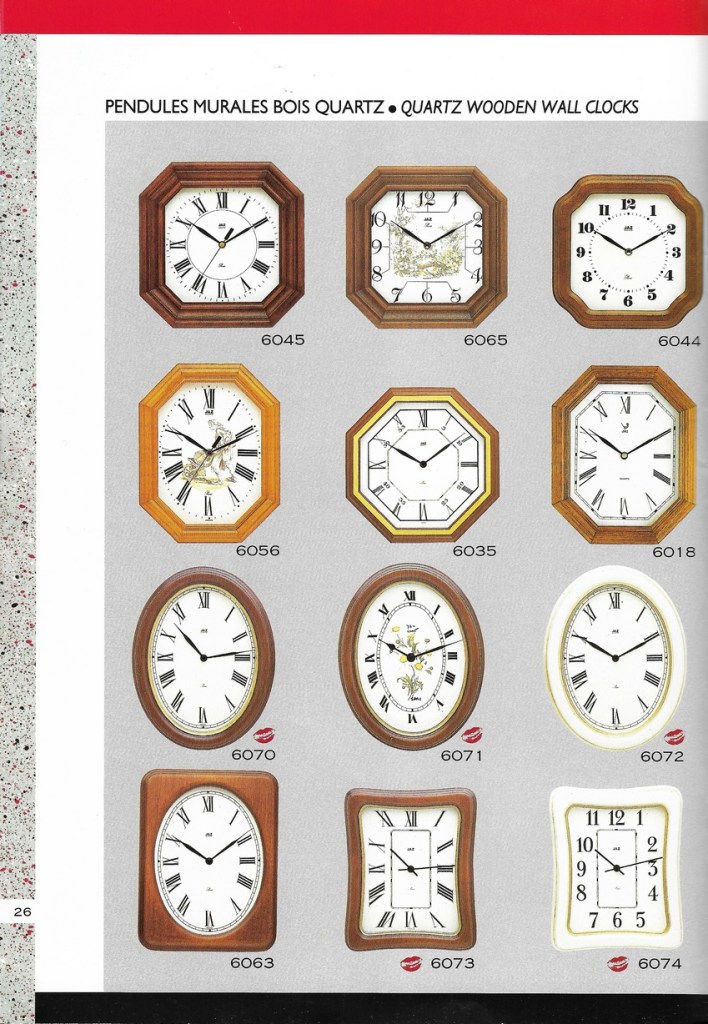 6062 , horloge murale , gamme Jaz Quartz , corps rectangulaire à bords arrondis en bois , mouvement quartz à pile LR6 , mention France et Paris en bas et centre du cadran , mention au dos assembled in France , chemin de fer rectangulaire en bas de cadran , aiguilles noires , format 26,5 x 21 cm . Nouveauté du catalogue 1986 , présente jusqu’au catalogue 1991:1992 où apparaissent les variantes 6107 à décor imitation loupe et cadran à chiffres romains et 6108 à décor style Art Nouveau et cadran à chiffres arabes + enluminures