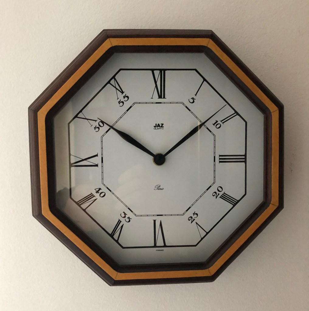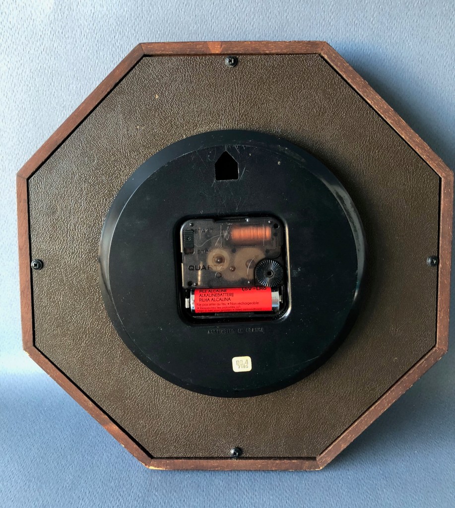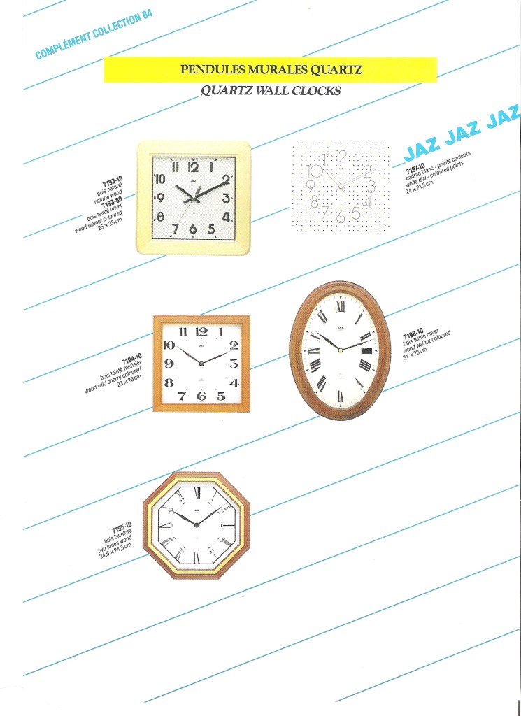 7195-10 puis 6035 , horloge murale , forme octogonale , en bois bicolore , chemin de fer à l’intérieur de la zone des chiffres romains , aiguilles noires feuilles , gamme Jaz Quartz et Jaz Paris , mouvement à quartz , calibre MAK , à pile LR6 , mention France en bas de cadran , format 24,5 x 24,5 cm . Nouveauté du complément de catalogue 1984 référencée 7195-10 puis référencée 6035 dans le catalogue 1985 à la page 20 , présent au catalogue 1986 page 25 et catalogue 1987 à la page 26 .