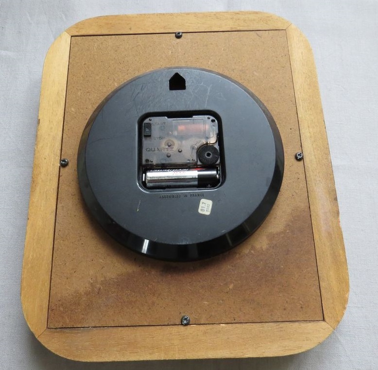 SURTIC , pendule murale de la gamme Jaz Paris , mouvement à quartz , pile LR6 , calibre MAK . Nouveauté du catalogue 1984 , référencée 7190-80 . Boîtier en bois , coin en laiton doré , chiffres romains , trotteuse centrale noire à talon rectangulaire , aiguilles poire et feuille noires , vitre plexiglas plat , mention France en bas de cadran et assembled in France au dos . Format 24,8 x 24,8 cm . Photos courtoisie du collectionneur Marc Barat .