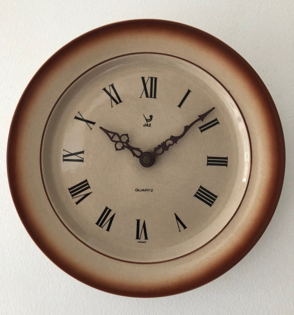 RIBIC , pendule murale en forme d’assiette de la gamme Jaz Electronic , mouvement électrique à pile LR14 , calibre TM , licence ATO. Nouveauté du catalogue JAZ export de 1977 à la page 44 , référencée 4285-14 . Assiette en porcelaine à décor floral ; chiffres romains . Diamètre 26 cm . La RIBIC n’est disponible que dans ce catalogue à l’export , elle n’était pas vendue en France .