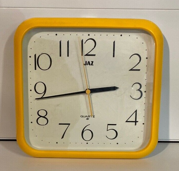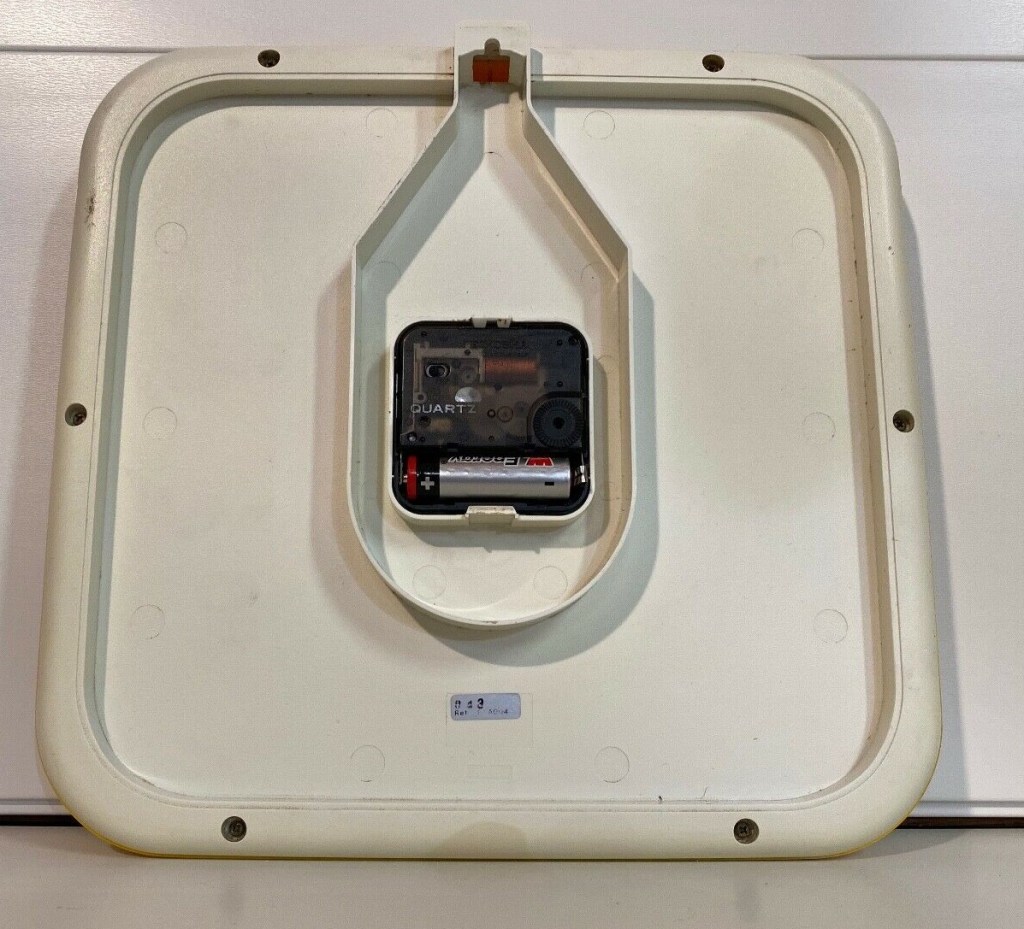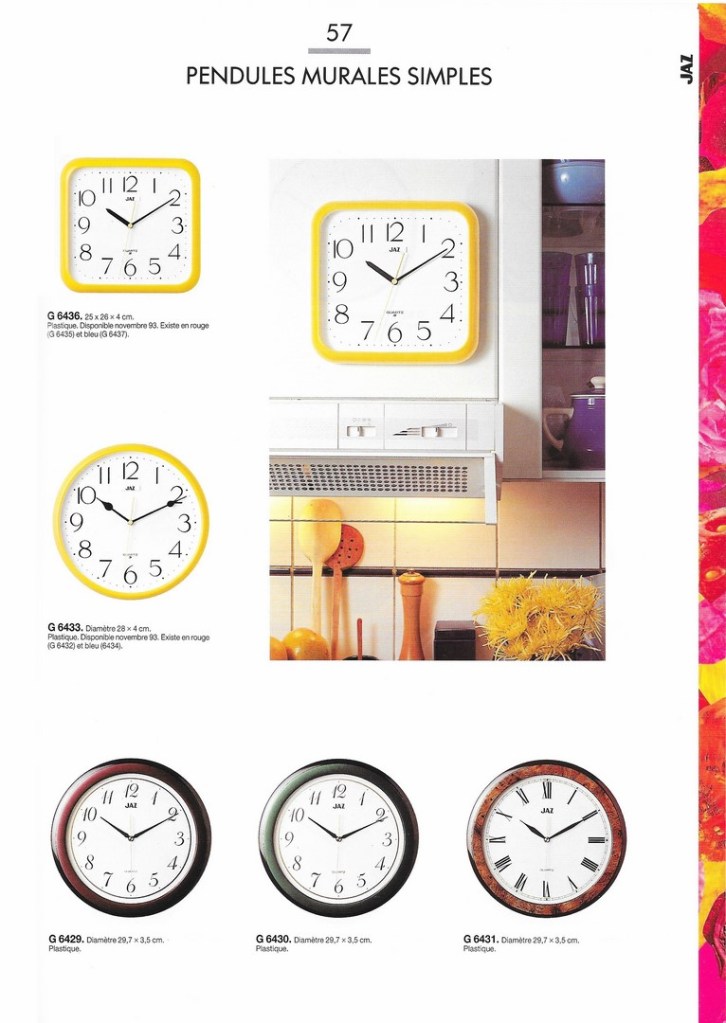 6435/6436/6437. murale quartz 1993 à 1995 , horloge murale , gamme des pendules murales simples , corps en plastique , mouvement quartz à pile LR6 , mouvement Seikosha made in Japan , trotteuse centrale bleue . Nouveauté du catalogue 1993/1994 à la page 57 ; existe en bleu référencé 6437, en jaune réf. 6436 ou en rouge réf. 6435 , trotteuse centrale coordonnée à la couleur du corps. Format 25 x 26 x 4 cm.