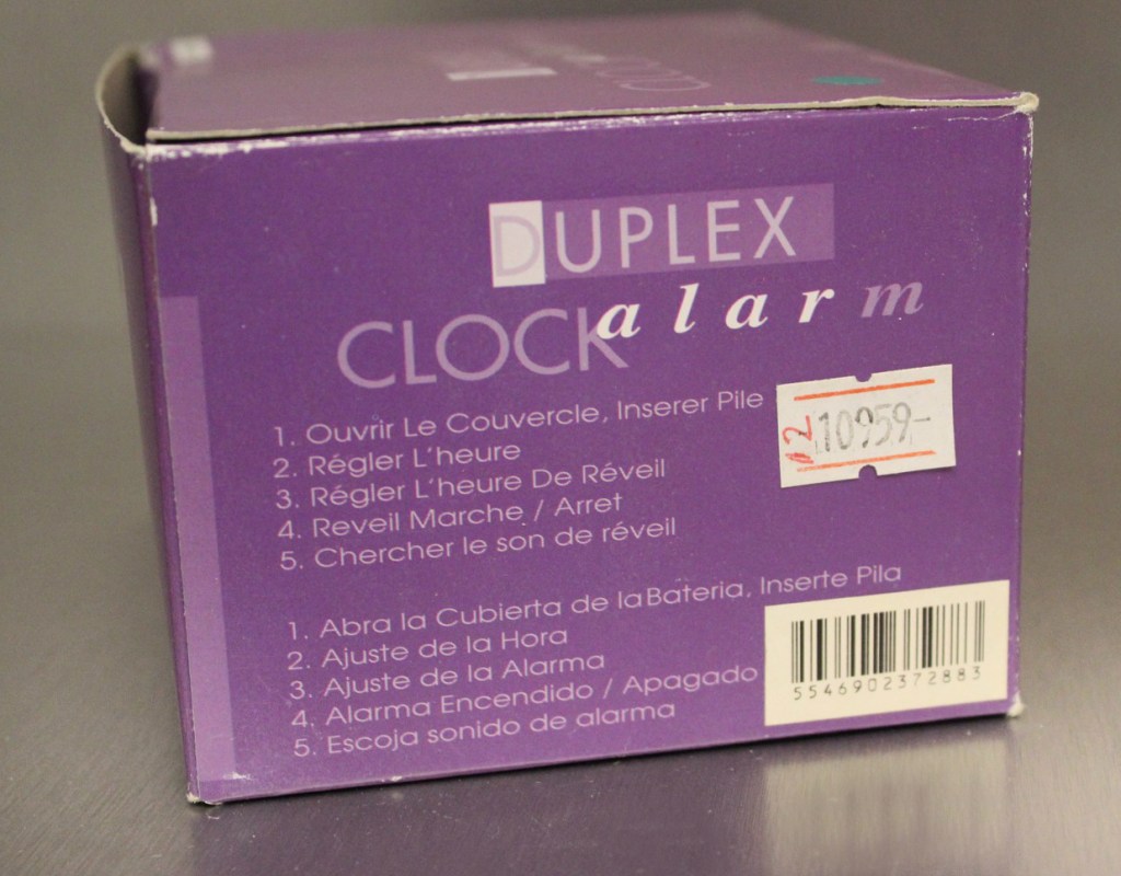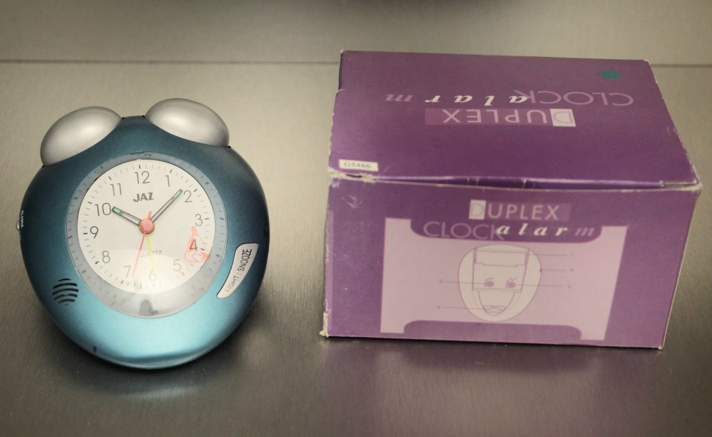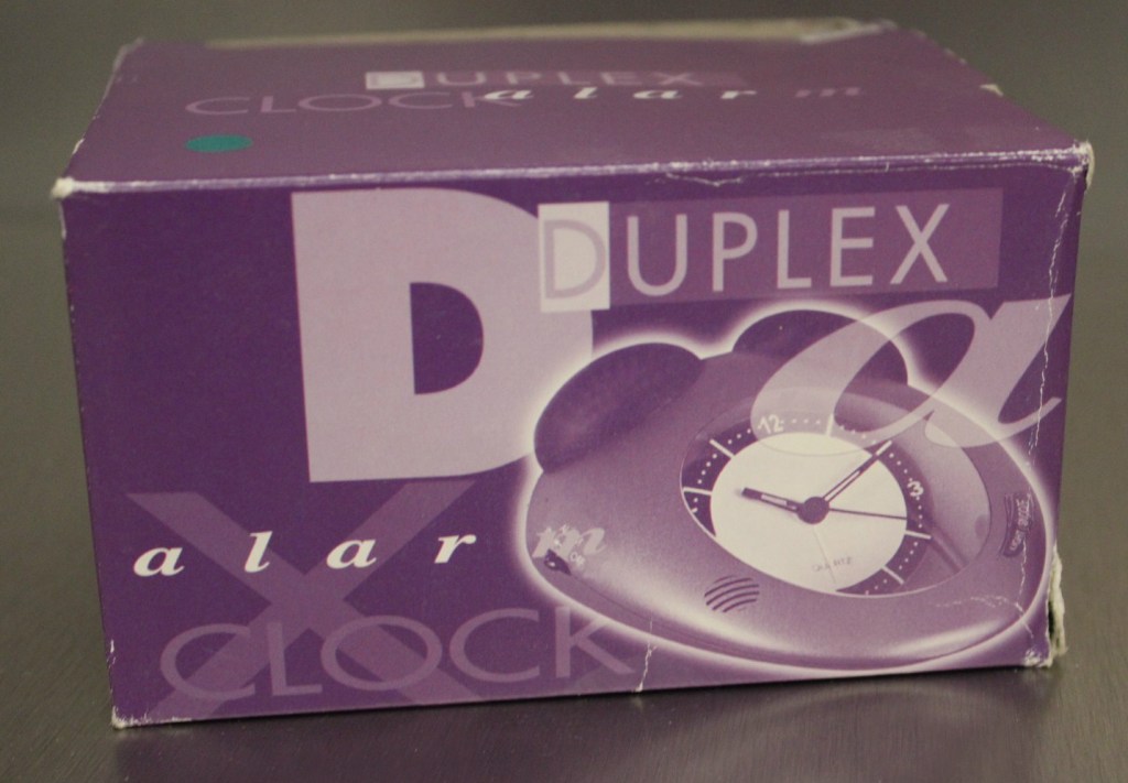 G5486 , réveil , Jaz quartz , corps en plastique bleu , deux piles LR6, les deux »oreilles » sont des cloches puisque qu’un bouton permet de choisir entre sonnerie à cloches ou par buzzeur , trotteuse centrale rouge , pointes des aiguilles lumineuses , nommé DUPLEX et référencé G5486 design Made in Hong Kong et fabrication made in China , poids sans les piles 150 gr , longueur 12 cm . circa 1999