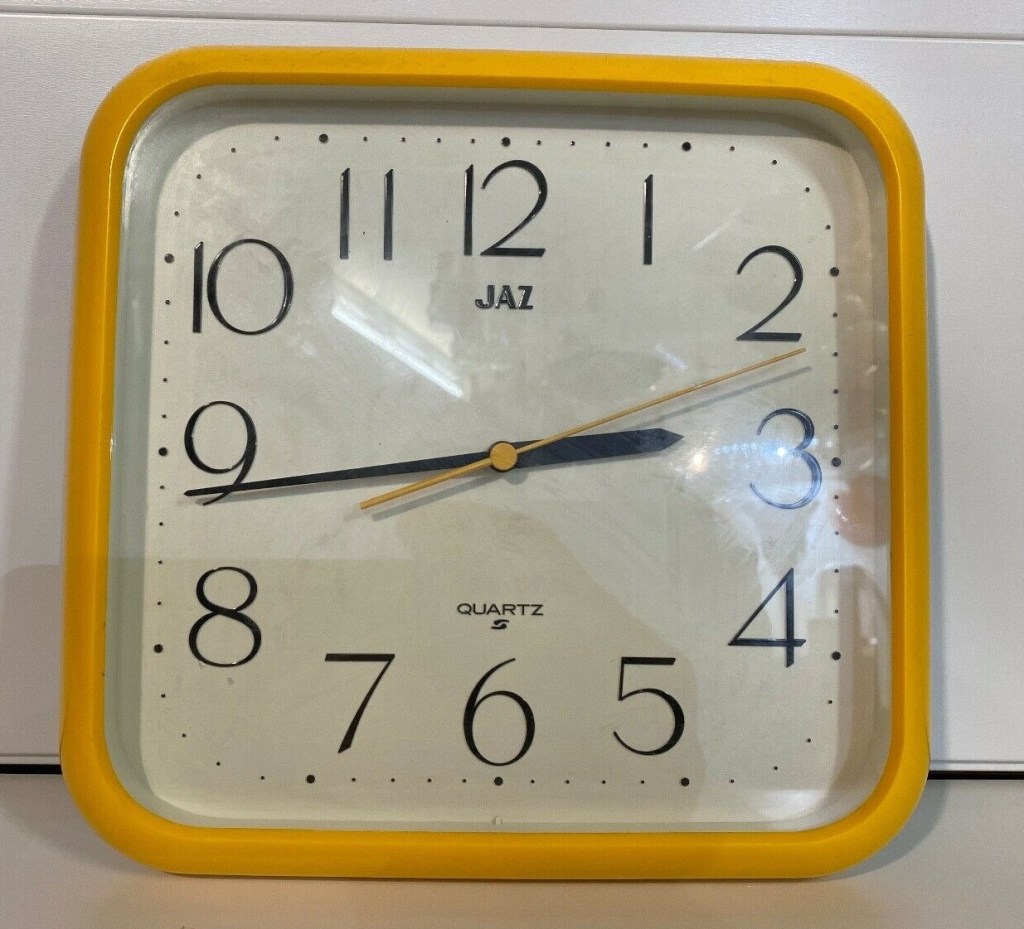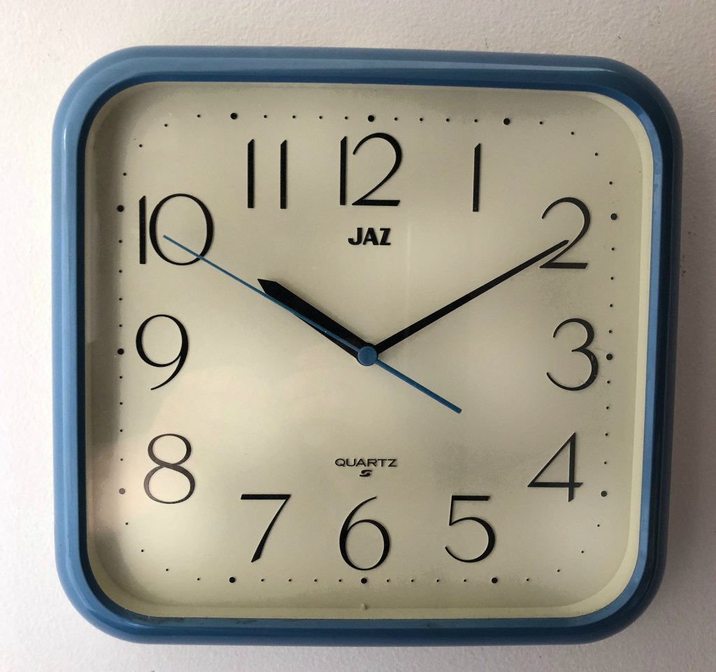 Jaz Electrico, horloge murale, corps bleu en plastique, trotteuse centrale rouge , aiguilles noires , calibre TM à pile LR14. Export Espagne, hors catalogue en France.