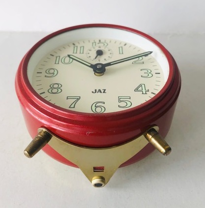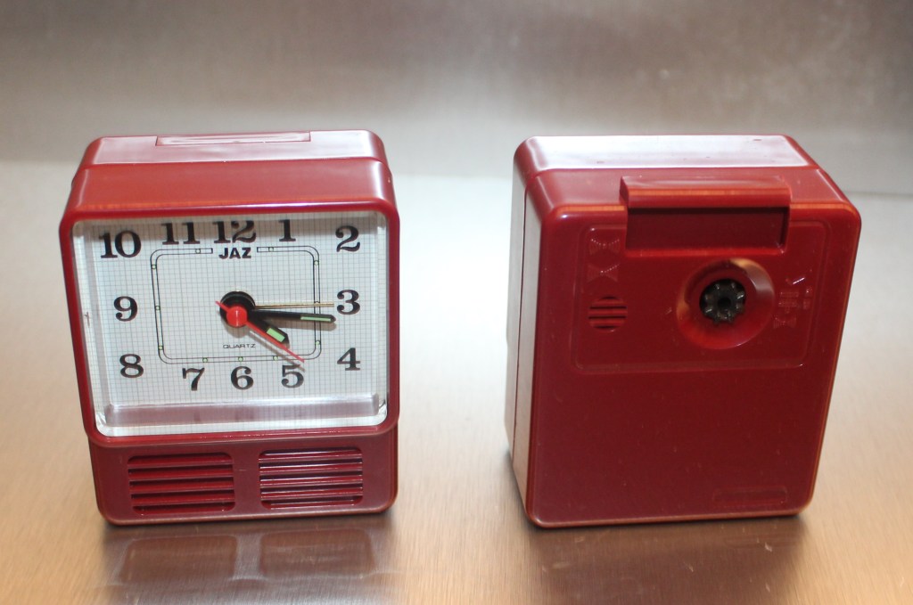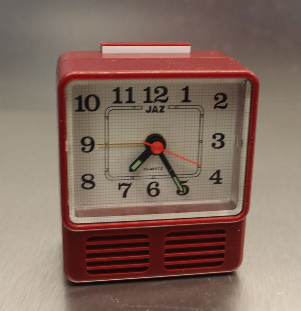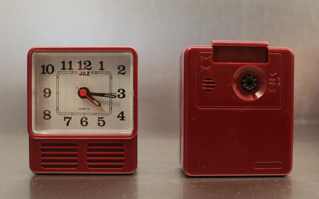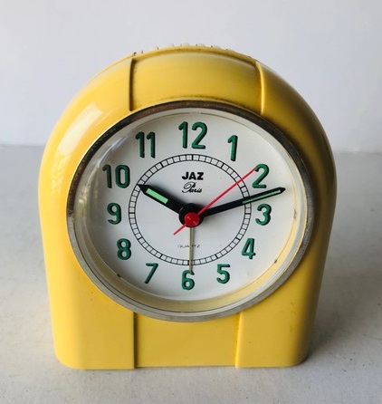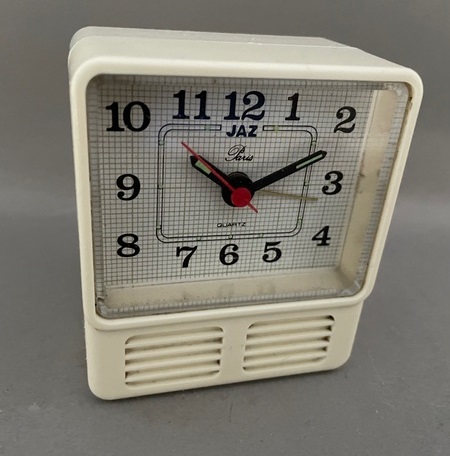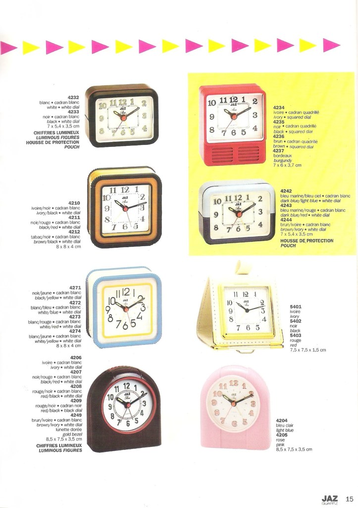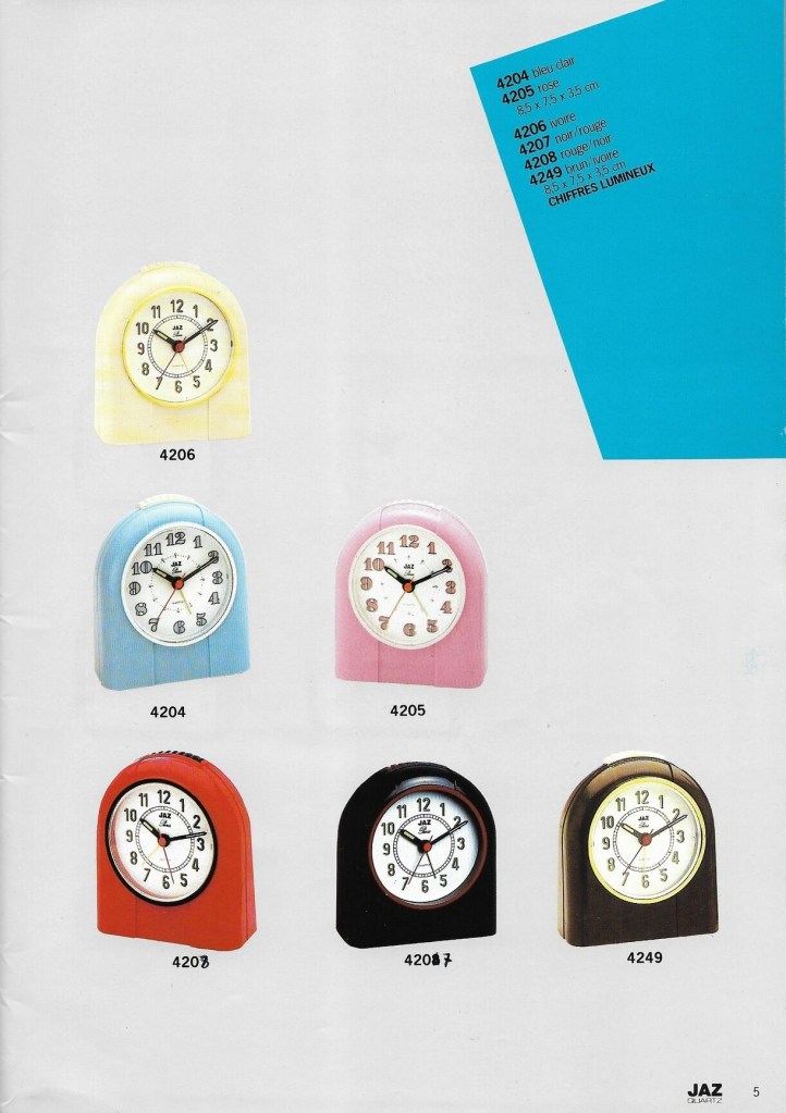 4206/4207/4208/4249 réveil , forme borne , gamme Jaz Paris, quartz à pile LR6 , corps en plastique de couleur, chemin de fer rond à l’intérieur de la zone des heures , aiguilles plastique noires, aiguilles et chiffres lumineux, trotteuse centrale rouge, arrêt de sonnerie au sommet, format 8,5 x 7,5 x 3,5 cm. Trois couleurs disponibles de 1986 à 1989 : corps ivoire/lunette dorée réf. 4206 ; corps noir/lunette rouge réf. 4207 ; corps rouge/lunette noir réf. 4208; corps brun/lunette ivoire réf. 4249.