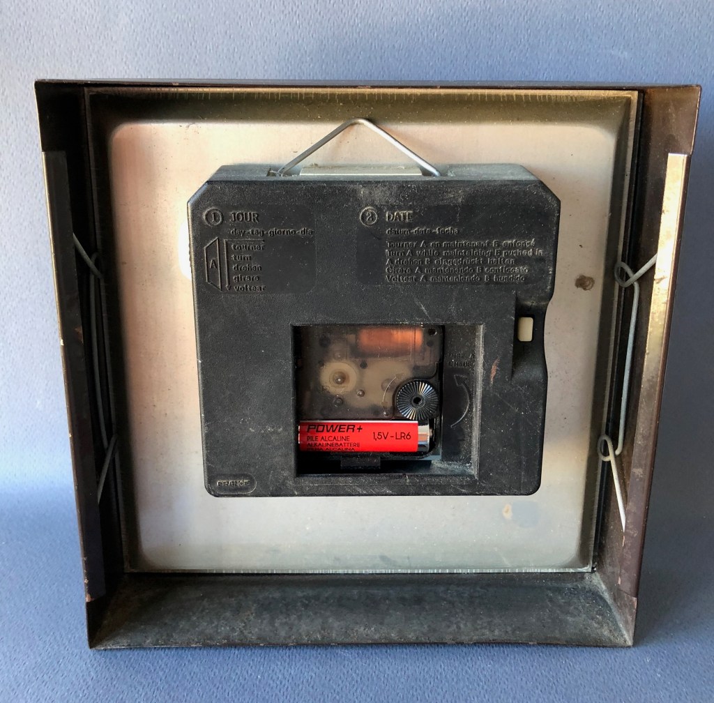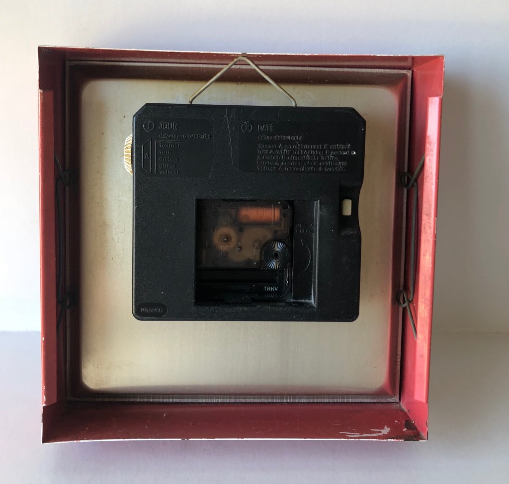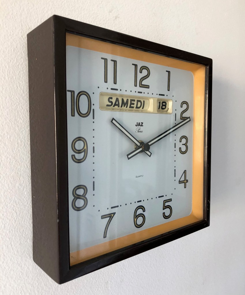 7157 , horloge murale à dateur gamme Jaz Paris , jour et date , mouvement quartz à pile LR6 , calibre JAK , corps en métal , forme carré 20,5 x 20,5 cm , nouveauté du catalogue 185 à la page 27 . Existe en blanc réf 7157 , rouge réf.7159 et brun réf. 7161