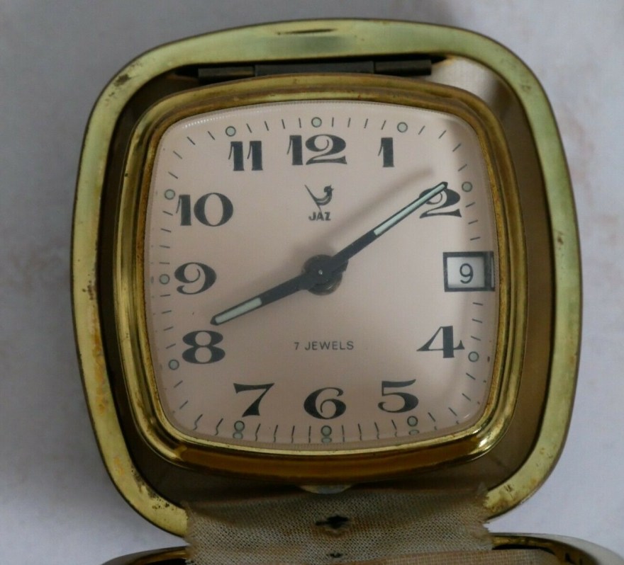 3401 réveil de voyage , dateur à date sans jour , gainage de skaï façon cuir , bordeaux réf.3401 ou brun réf.3402 , mouvement mécanique , calibre CS , mono-barillet donc clef unique de remontage , 7 jewels , aiguilles et points lumineux , format 7x7x3 cm ; présent aux catalogues 1985 et 1986