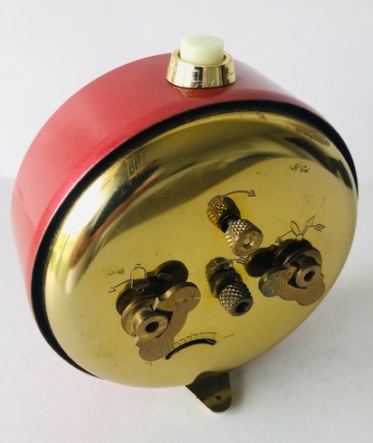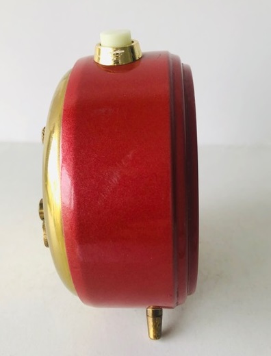 4380/4381 réveil , quartz à pile LR6 , corps en plastique , arrêt de sonnerie au sommet , trotteuse centrale , aiguilles plastique noir, sonnerie sur cloche intérieure , aiguilles et chiffres lumineux , format 11 x 9 x 6 cm ; existe en rouge réf. 4380 et brun réf. 4381
