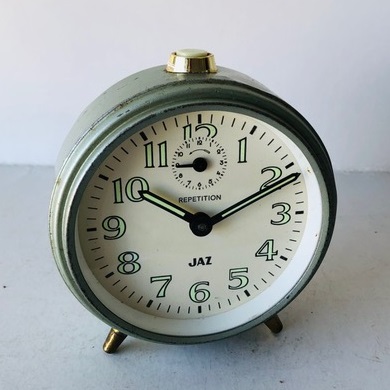 2518/2520 , réveil rond à répétition de sonnerie , présent uniquement au catalogue 1990 catégorie Les Classiques page 21 , arrêt de sonnerie au sommet , corps en métal brun métallisé , mouvement mécanique , diamètre 9,5 cm , aiguilles noires , aiguilles noires , aiguilles et chiffres lumineux , existe en rouge réf. 2519 et en bleu réf. 2520.