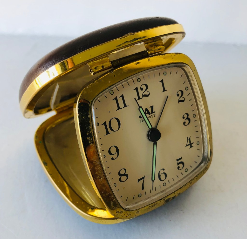 5415 , réveil de voyage , corps gainé de skaï brun , gamme Jaz Quartz , aiguilles seringueslumineuses , calibre 21903 , pile LR44, format 7 x 7 cm . Existe en skaï bordeaux référencé 5414 , nouveauté du catalogue 1988/1989 page 19 .