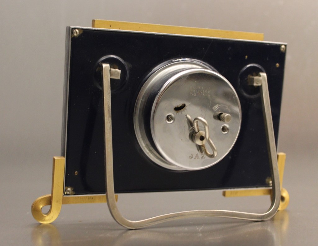 Boîtier en métal doré , cadran argenté ; aiguilles et points lumineux . Diamètre 7,5 cm  , poids 230 gr . Il n’est plus disponible en 1954 .