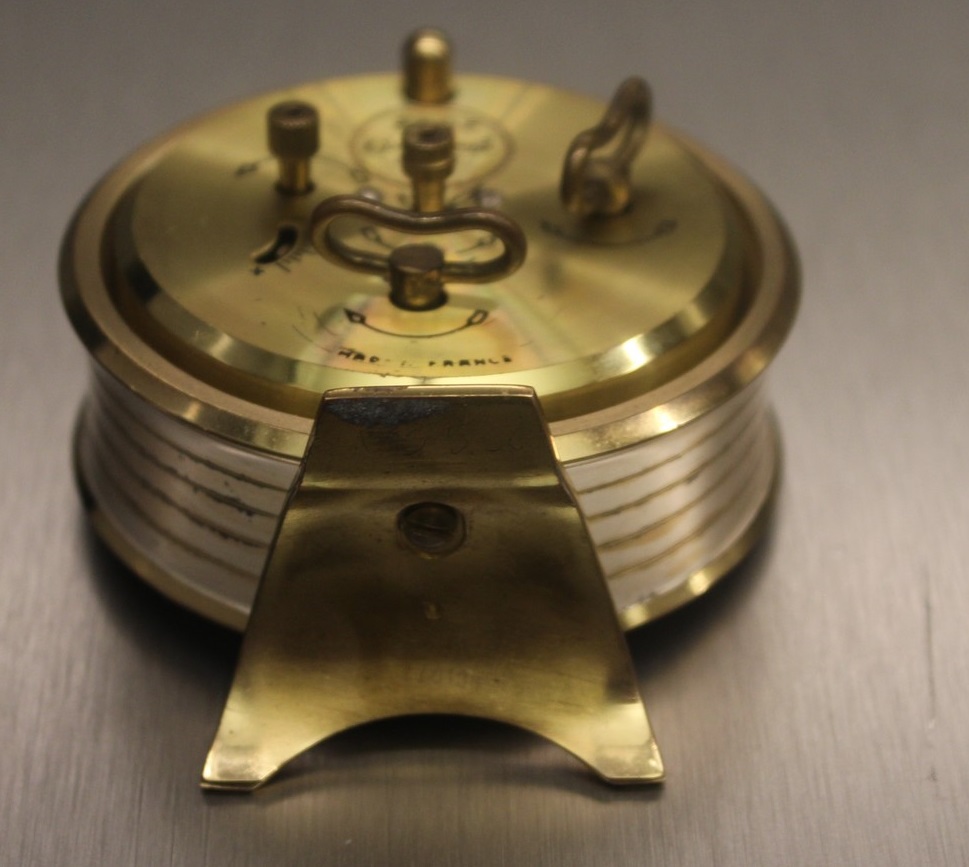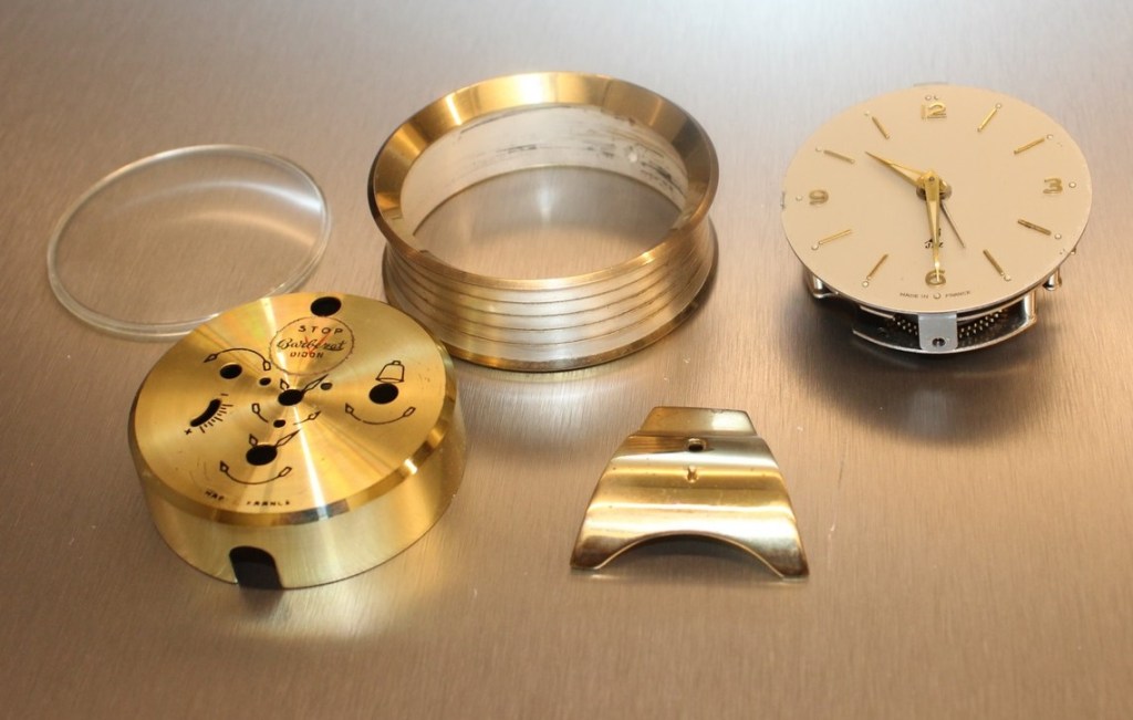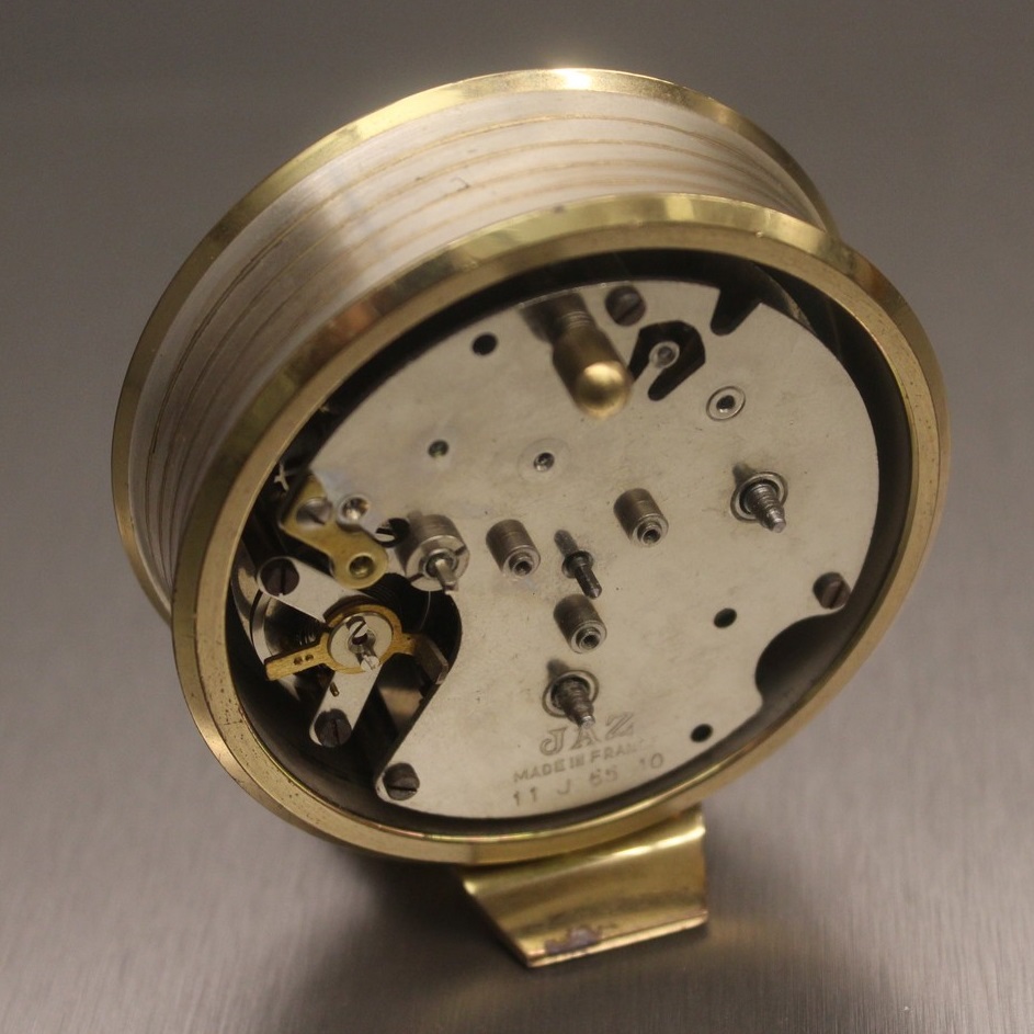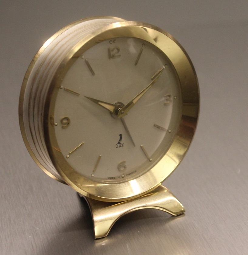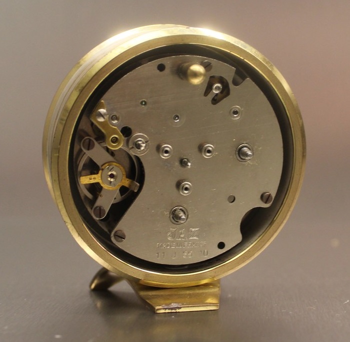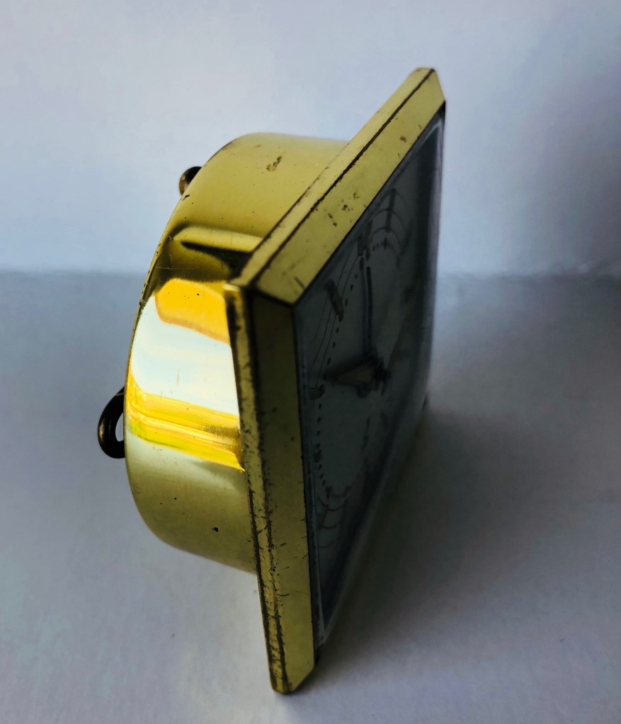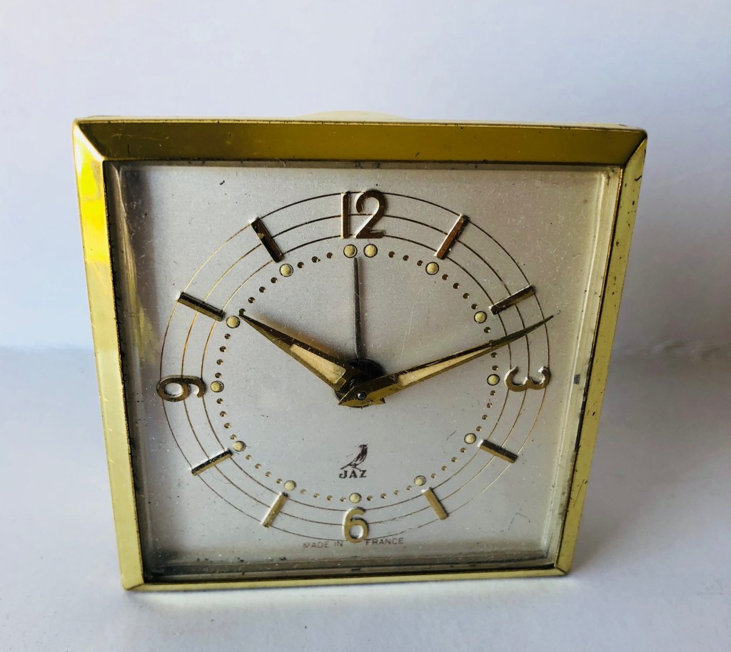 TRENTIC 1419-55 vert uni TRENTIC , réveil de voyage de la gamme des Stylites , mouvement mécanique , calibre 1AE , 30 heures , 7 pierres , 7 jewels mentionnés au cadran sous le logo et sur le dos-cloche , une seule clé pour remonter mouvement et sonnerie . Nouveauté du catalogue de 1957 à la page 8 . Forme portefeuille gainé cuir , lunette et cloche en métal doré , cadran argenté mat à filets « or », chiffres cernés noir, verre biseauté aiguilles et points lumineux . Format 7,5 x 8,5 cm , épaisseur 3,5 cm , poids 220 gr .