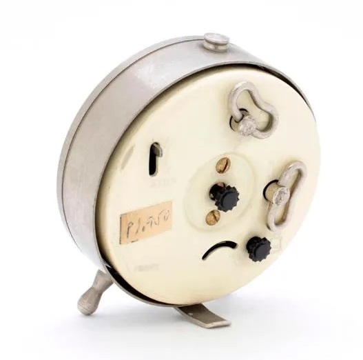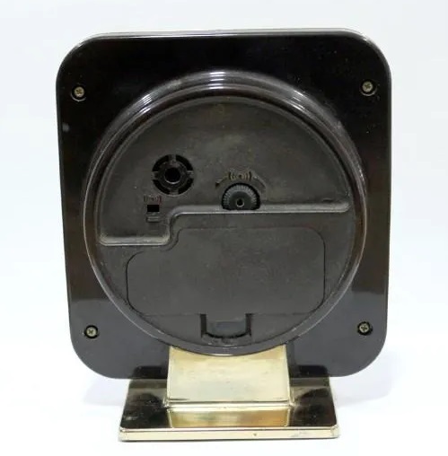 Boîtier en bois teinté , cadran orange métallisé , zone des chiffres bleue , lunette chromée , non lumineuse . Format 16 x 10 cm . Dotée d’un cadran inconnu aux couleurs vives inusitées , cette pendulette – datée de 1946 sur le calibre- n’apparaît dans aucun catalogue , ni aucune collection connue hormis la nôtre mais semble d’évidence succéder à la CRAMIC d’avant guerre en remplaçant le verre teinté par du bois . La dénomination CRAMIC sera réattribuée en 1980 .