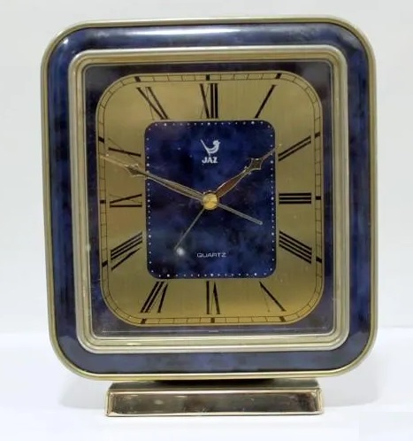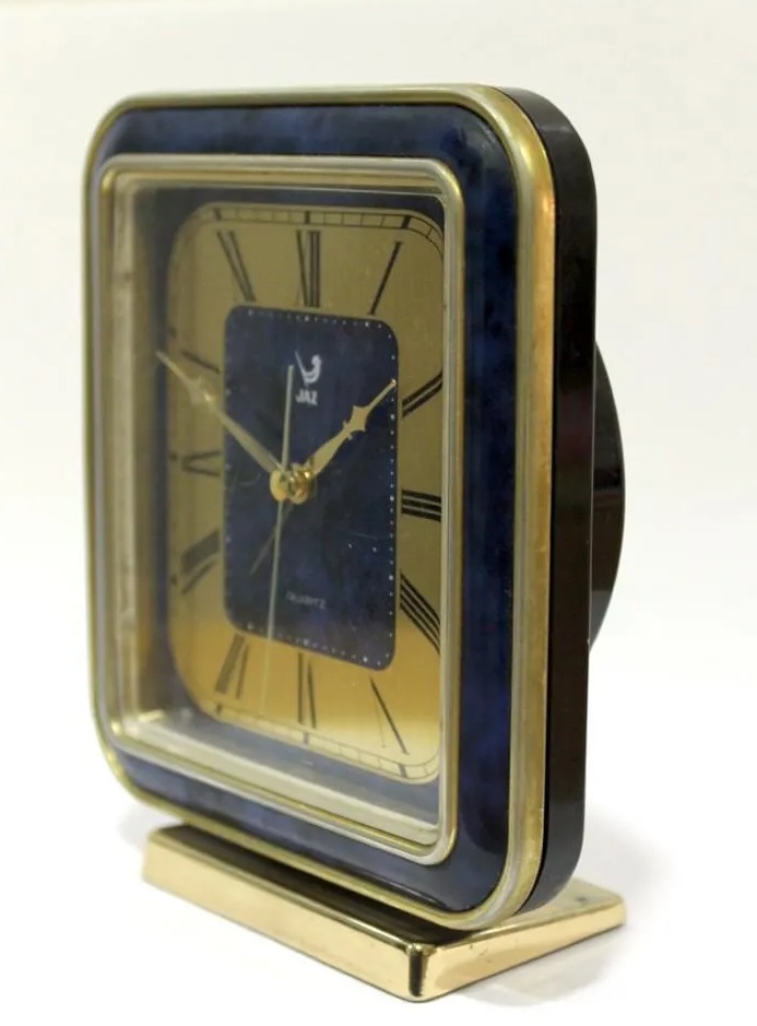 Cette couleur est répertoriée Saphir par Jaz et ses décorations sont chromées contrairement au modèle émeraude dont le décor est doré . Les éléments de décor démontre que Jaz a abordé le Style Streamline ou Style paquebot , tendance tardive de l’Art Déco qui recherche les formes lisses, privilégie les longues lignes horizontales en introduisant des éléments empruntés à l’univers nautique ou aéronautique tel que les étraves , les bastingages ou les hublots chromés