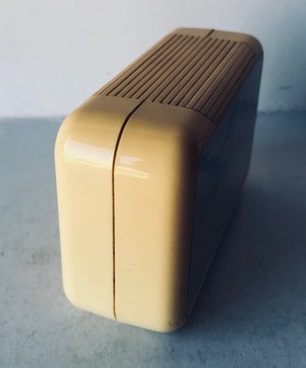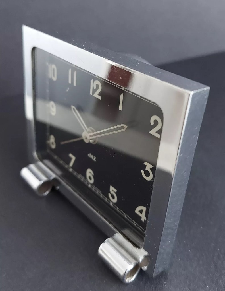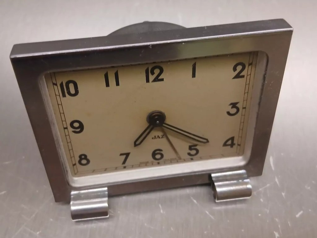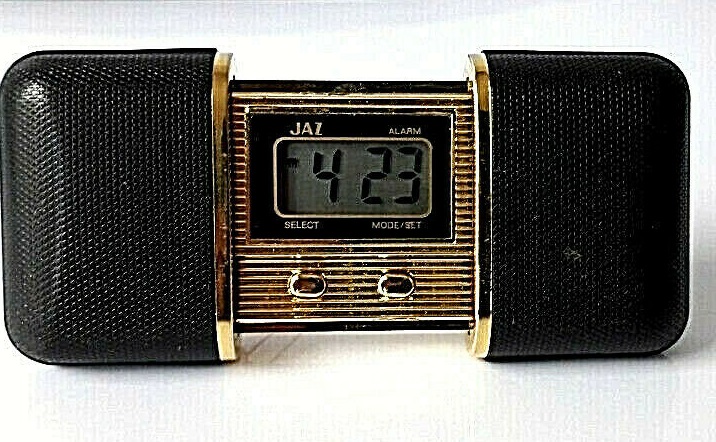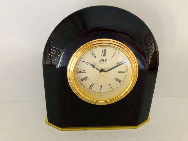 CORONET , horloge murale à Quartz , par Jaz Paris France , comme indiqué en haut et en bas de l’index du 6 . Elle est fort similaire à la NANRIC de Jaz qui n’apparaît qu’en 1980 .Corps en plastique brun ,vitre en plexiglas , aiguilles noires fines , trotteuse centrale à talon rectangulaire , cadran doré , chiffres en fort relief , format 22,5 x 22,5 cm .