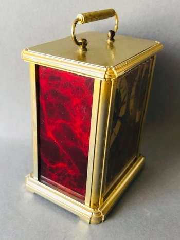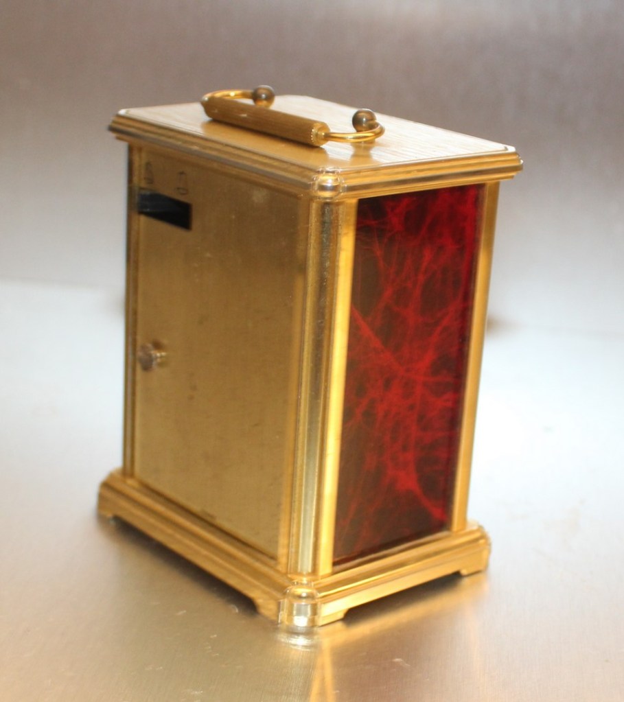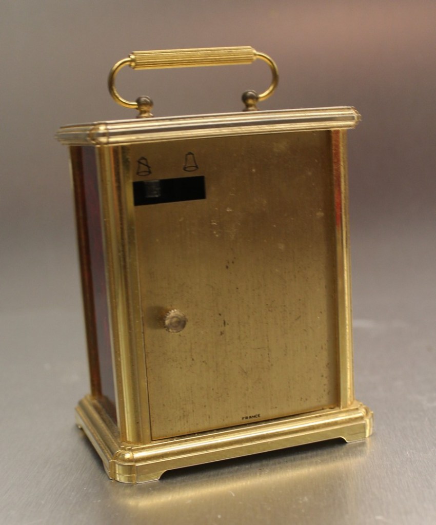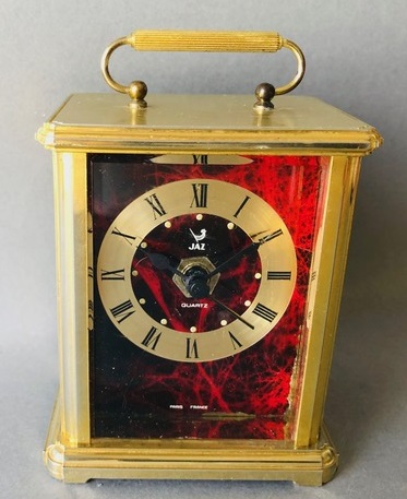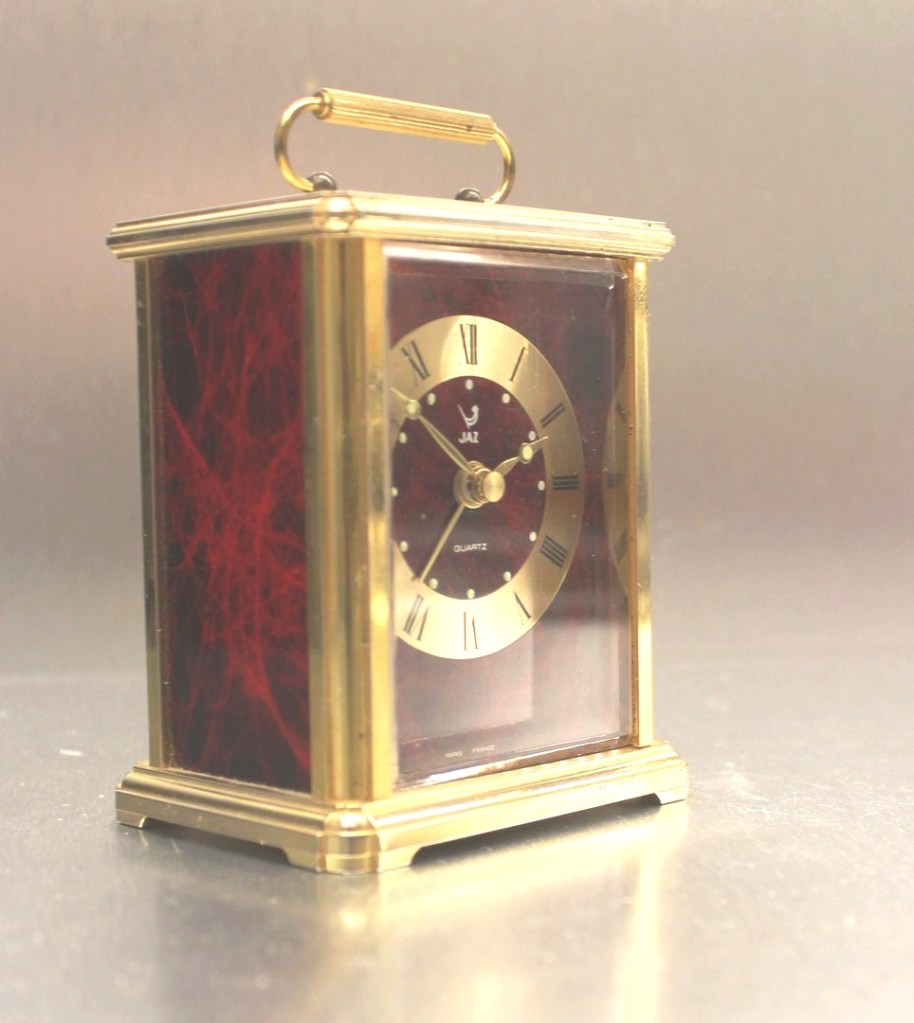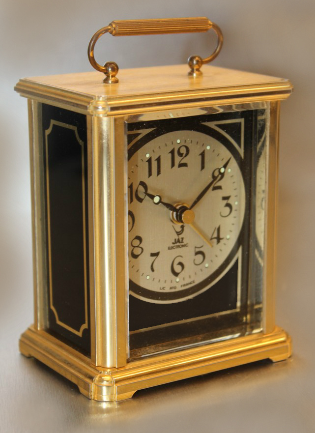 CAILLIC , réveil style pendulette d’officier , Jaz Electronic , sonnerie par moduleur buzzer , mouvement électronique à pile , à tic-tac discret , calibre TR , licence ATO . Nouveauté du catalogue 1977 à la page 5 référencée 4434-71 . Boîtier en laiton , bélière , socle en plastique façon métal doré , chiffres romains sur zone façon or , couleur écaille -à l’origine de son nom- sur cadran et joues , aiguilles Breguet , aiguilles et points lumineux , bélière , arrêt de sonnerie au sommet, vitre en plastique biseauté . Format 8 x 9,5 cm , poids sans la pile 280 gr.