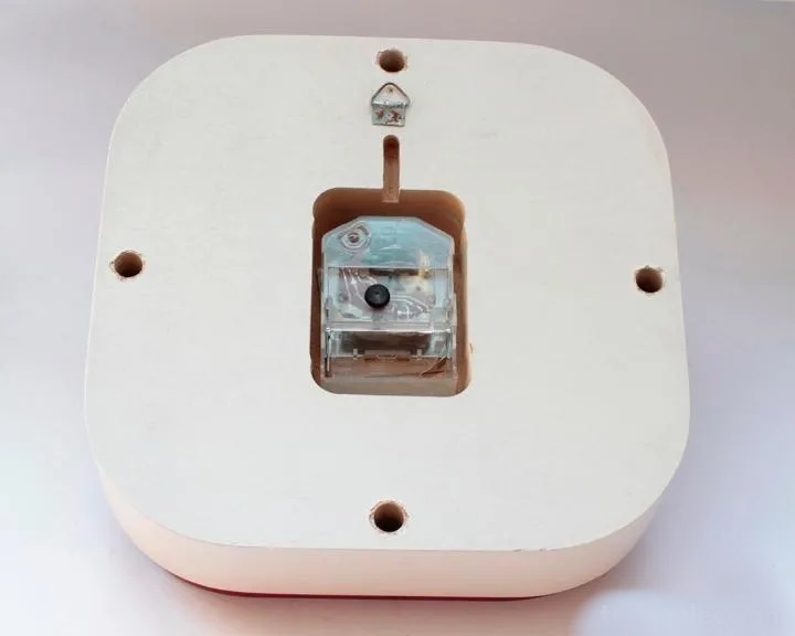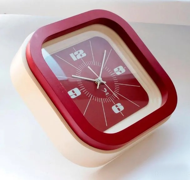 Jaz Electrico, horloge murale, corps en bois peint en rouge , carré à bords arrondis , calibre TM , à pile LR14, trotteuse centrale blanche , quatre chiffres cardinaux , aiguilles blanches , format 26,5 x 26,5 cm , épaisseur 8 cm . hors catalogue France, uniquement export Espagne.