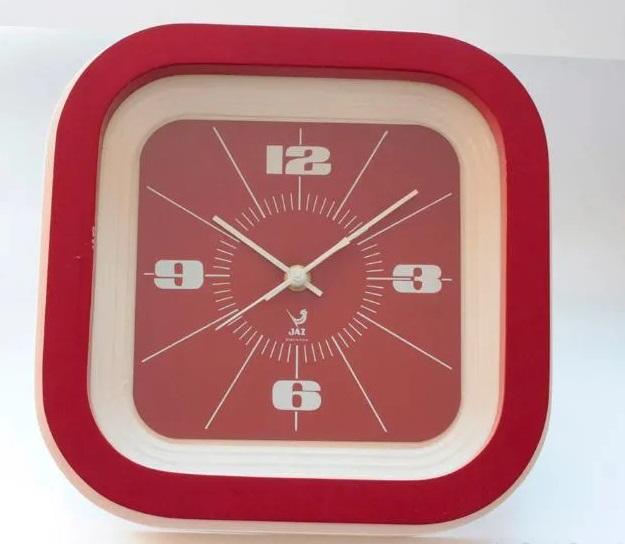 HILLIC réf. 6306-62 rouge, exemplaire ci-dessus vendu en GB HILLIC , pendule murale de la gamme Jaz Electronic , mouvement électrique à pile , calibre TM , licence ATO. Réservée à l’exportation. Référencée 6306-42 pour la version noire, 6306-52 pour la bleue et 6306-62 pour la rouge dans le catalogues Jaz Exportde 1976 à la page 44 , il n’est plus au catalogue en 1977. Corps en matière plastique , aiguilles blanches , trotteuse centrale à talon rectangulaire . Diamètre 23 cm .HILLIC Jaz ci-dessus HILLIC Japy ci-dessous