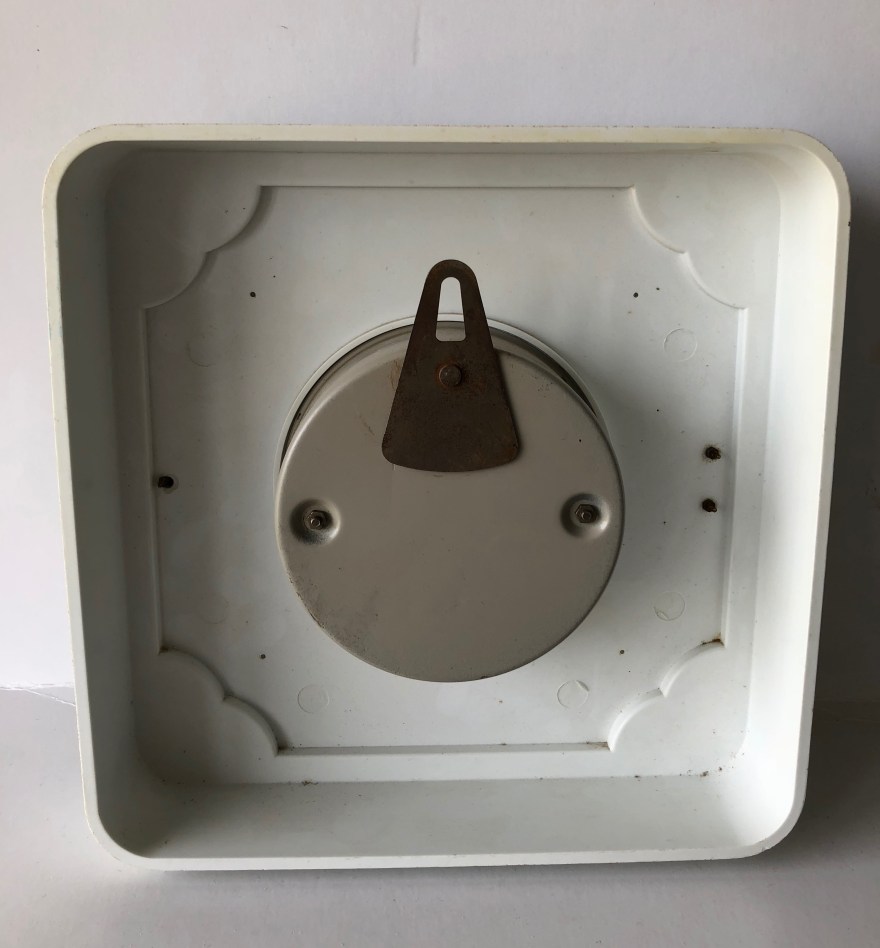 CLOISIC , horloge murale , mouvement mécanique à clé , calibre 1AG , autonomie 8 jours . Nouveauté du catalogue 1957 à la page 20 . Boîtier en Pollopas , lunette en métal , vitre en verre bombé . Deux versions disponibles en 1957 : boîtier blanc , lunette dorée , chiffres et points d’heures blancs sur zone rouge , aiguilles glaives dorées , réf.1644-10 ou idem sauf lunette chromée , zone des heures verte et aiguilles glaives brunes réf.1644-20 . Format 20,5 x 20,5 cm, poids 880 gr .