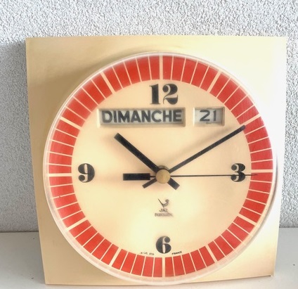 PLATIC 1658-20. PLATIC , horloge murale , mouvement mécanique à clé amovible , calibre 1AG , autonomie 8 jours . Nouveauté du catalogue 1958/59 à la page 21 . Boîtier en Formica , jonc au pourtour , lunette ouvrante à droite en métal doré , vitre en verre bombé , aiguilles en métal doré , chiffres en relief . Format 26,5 x 22 cm , poids 785gr .