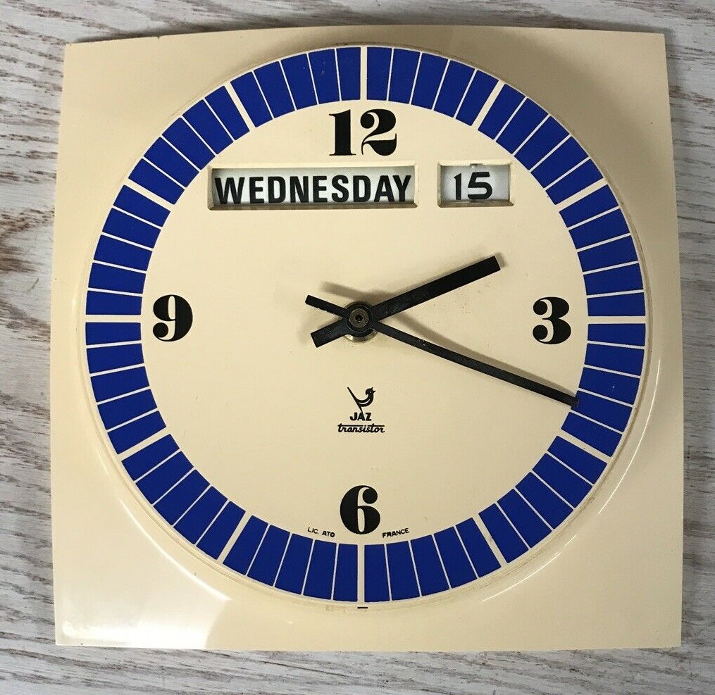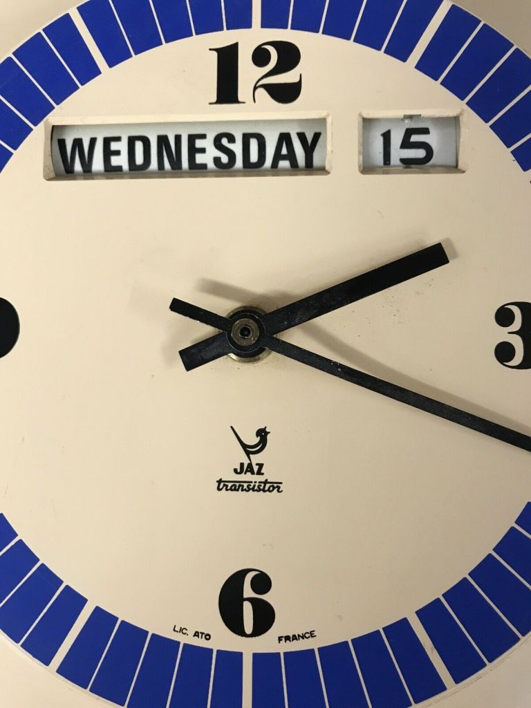LAMBRIC , pendule murale de la gamme Jaz Transistor , dateur , mouvement électrique à pile LR14, calibre FC , licence ATO . Disponible uniquement dans le catalogue 1972/73 à la page 25 . Boîtier plastique , vitre en plexiglas bombée , dateur jour et date , trotteuse centrale .