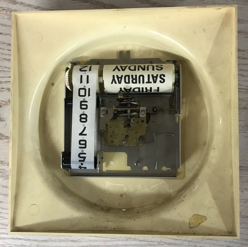 Boîtier en pollopas ivoire , lunette doré , chiffres en relief sur zone galbée , verre bombé . Diamètre 20,5 cm . Sa dénomination HUITIC fait référence à son autonomie de 8 jours .