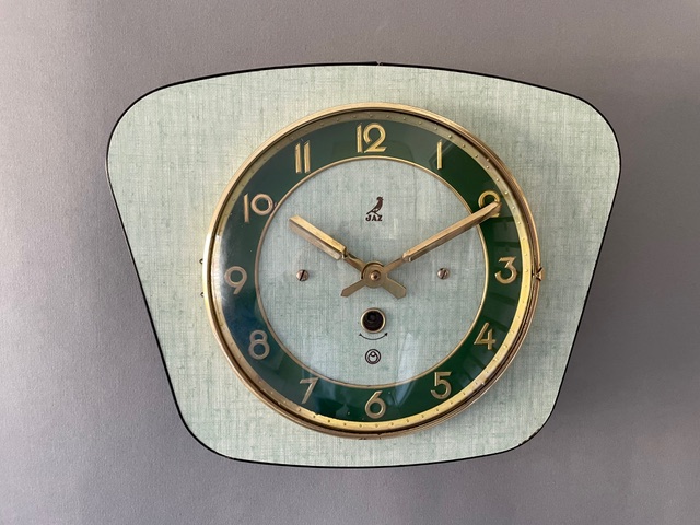 Calibre AG , mouvement mécanique à clef amovible , d’une autonomie de 8 jours . Il succède à partir de 1956 au calibre G qui avait doté les premières horloges murales de la marque depuis 1936 . Il est le dernier calibre mécanique à équiper des horloges murales jusqu’en 1963 . Dans le catalogue Jaz 1963/64 , il n’y a plus que des pendules murales à transistor .