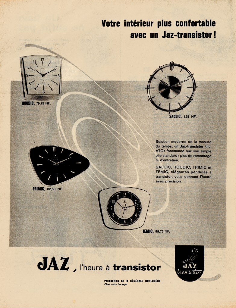 FIRMIC puis FRIMIC , horloge murale , gamme Jaz Electric, puis gamme Jaz Transistor , calibre 1AL à pile LR20 puis 1AN à pile LR14 . Nouveauté du catalogue 1961/62 à la page 18 . Boîtier en stratifié , jonc collé au pourtour , pas de chiffres mais des index en relief , aiguilles dauphines en métal doré , sans vitre ni trotteuse . Format 24 x 20 cm , poids 886 gr sans la pile .